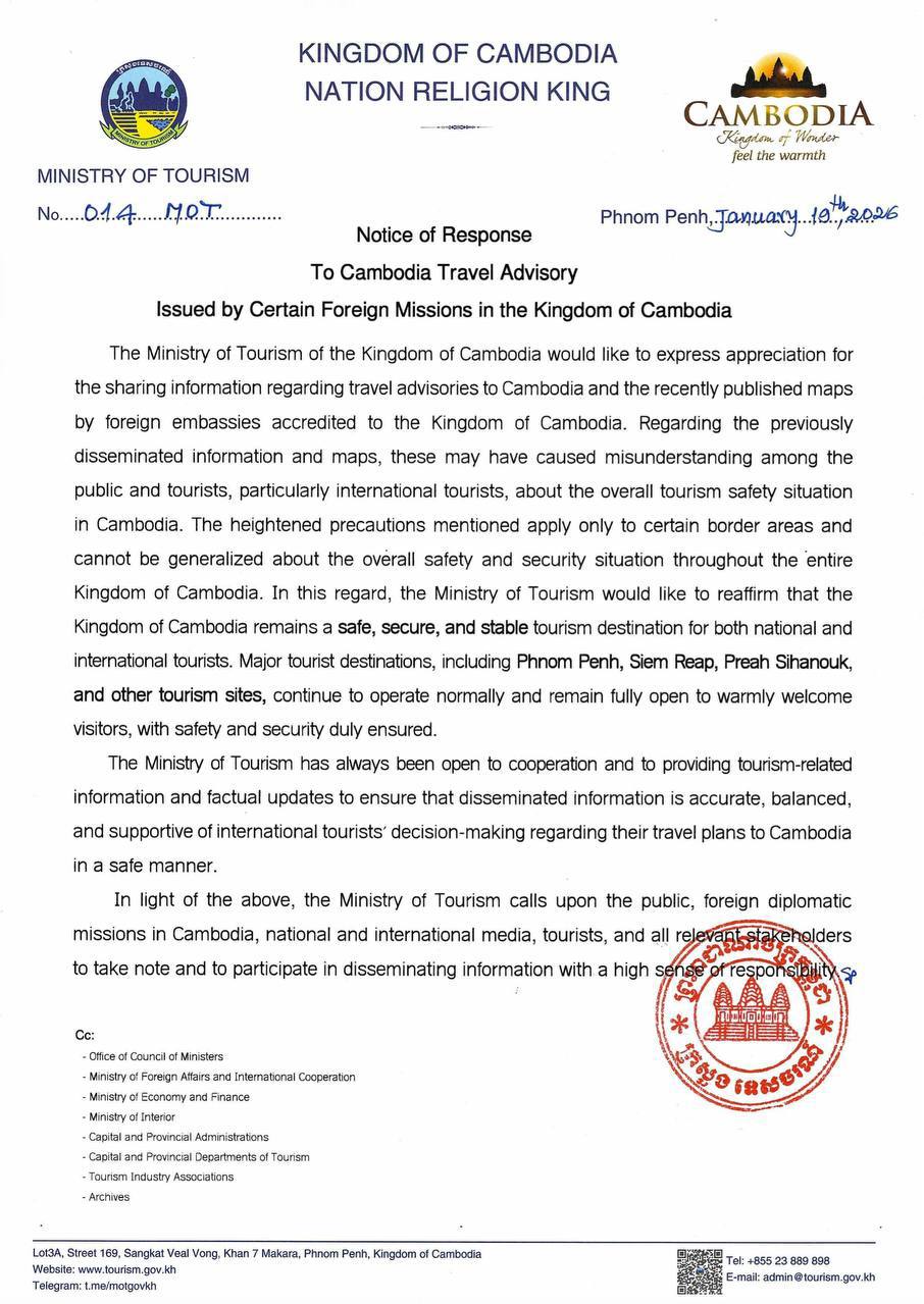On 19 January 2026, the Ministry of Tourism issued a notice of response to Cambodia travel advisory issued by certain foreign missions in the Kingdom of Cambodia.