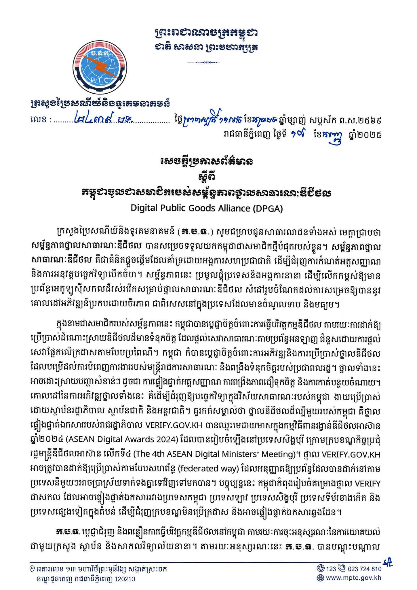On 18 September 2025, the Ministry of Post and Telecommunications issued a press release on Cambodia joining Digital Public Goods Alliance (DPGA). The DPGA is an initiative supported by the United Nations to promote the identification and implementation of open-source technologies.