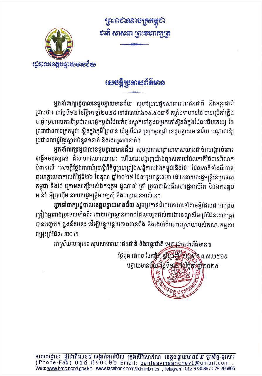 Press release of the spokesperson for Banteay Meanchey Provincial Administration on the civilian shooting by Thai forces