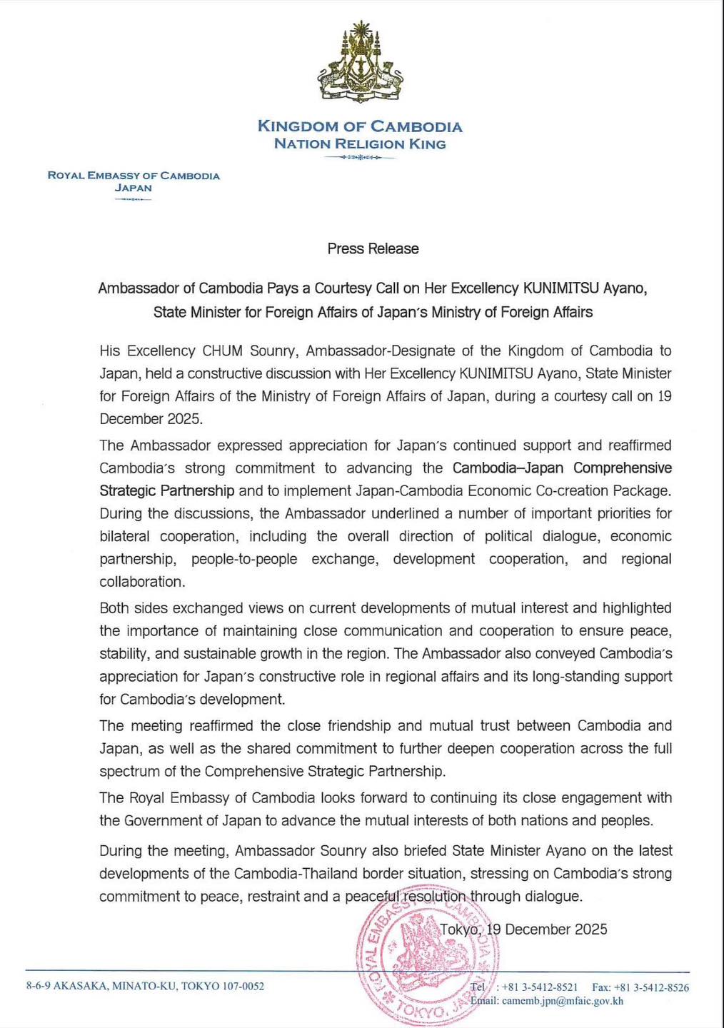 On 19 December 2025, the Royal Embassy of Cambodia in Japan issued a press release regarding the courtesy call by H.E. CHUM Sounry, Ambassador-Designate of Cambodia, on H.E. KUNIMITSU Ayano, State Minister for Foreign Affairs of Japan, to reaffirm the commitment to the Cambodia-Japan Comprehensive Strategic Partnership and the implementation of the Economic Co-creation Package. Both sides discussed key priorities, including political dialogue, economic partnership, and people-to-people exchanges. Additionally, the Ambassador briefed the State Minister on the latest developments regarding the Cambodia-Thailand border situation, emphasizing Cambodia’s strong commitment to peace, restraint, and a peaceful resolution through dialogue.