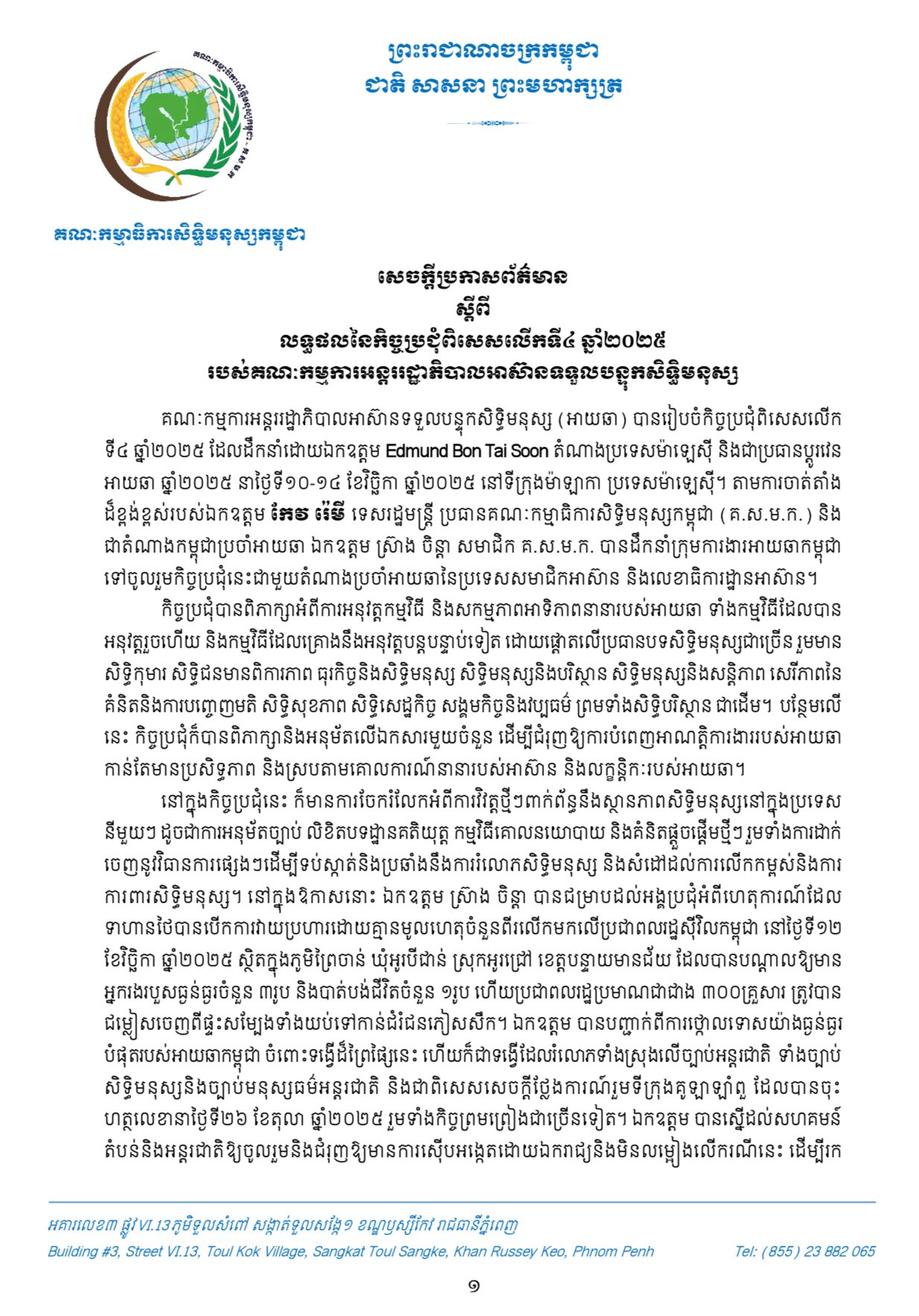 On 16 November 2025, the Cambodia Human Rights Committee (CHRC) issued a press release detailing the outcome of the 4th Special Meeting of 2025 of the ASEAN Intergovernmental Commission on Human Rights (AICHR), which took place in Malacca, Malaysia, from 10-14 November 2025. The meeting, attended by a Cambodian delegate from the CHRC, focused on strengthening and expanding deep cooperation in the field of human rights among AICHR members and other institutions, including sharing visions, challenges, and priority areas for cooperation.