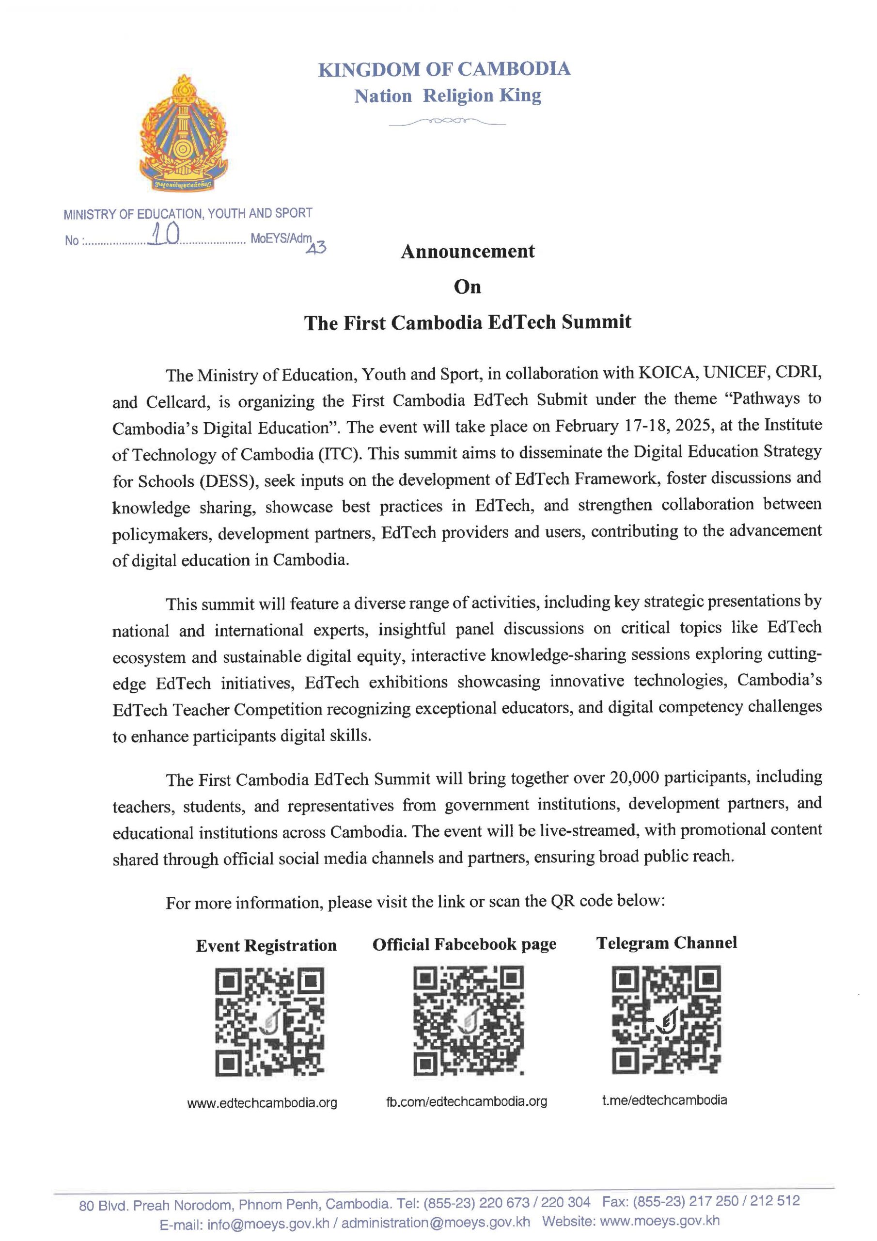 On 16 January 2025, the Ministry of Education, Youth and Sport issued an announcement on the First Cambodia EdTech Summit. This summit aims to disseminate the Digital Education Strategy for Schools (DESS), seek inputs on the development of EdTech Framework, foster discussions and knowledge sharing, showcase best practices in EdTech, and strengthen collaboration between policymakers, development partners, EdTech providers, and users, contributing to the advancement of digital education in Cambodia.