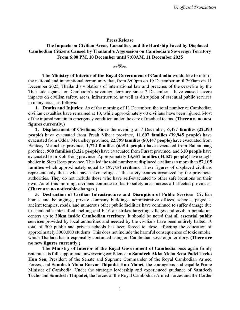 Press release: The impacts on civilian areas, and casualties caused by Thailand’s aggression on Cambodia’s sovereign territory from 6:00 pm, 10 December until 7:00 am, 11 December 2025