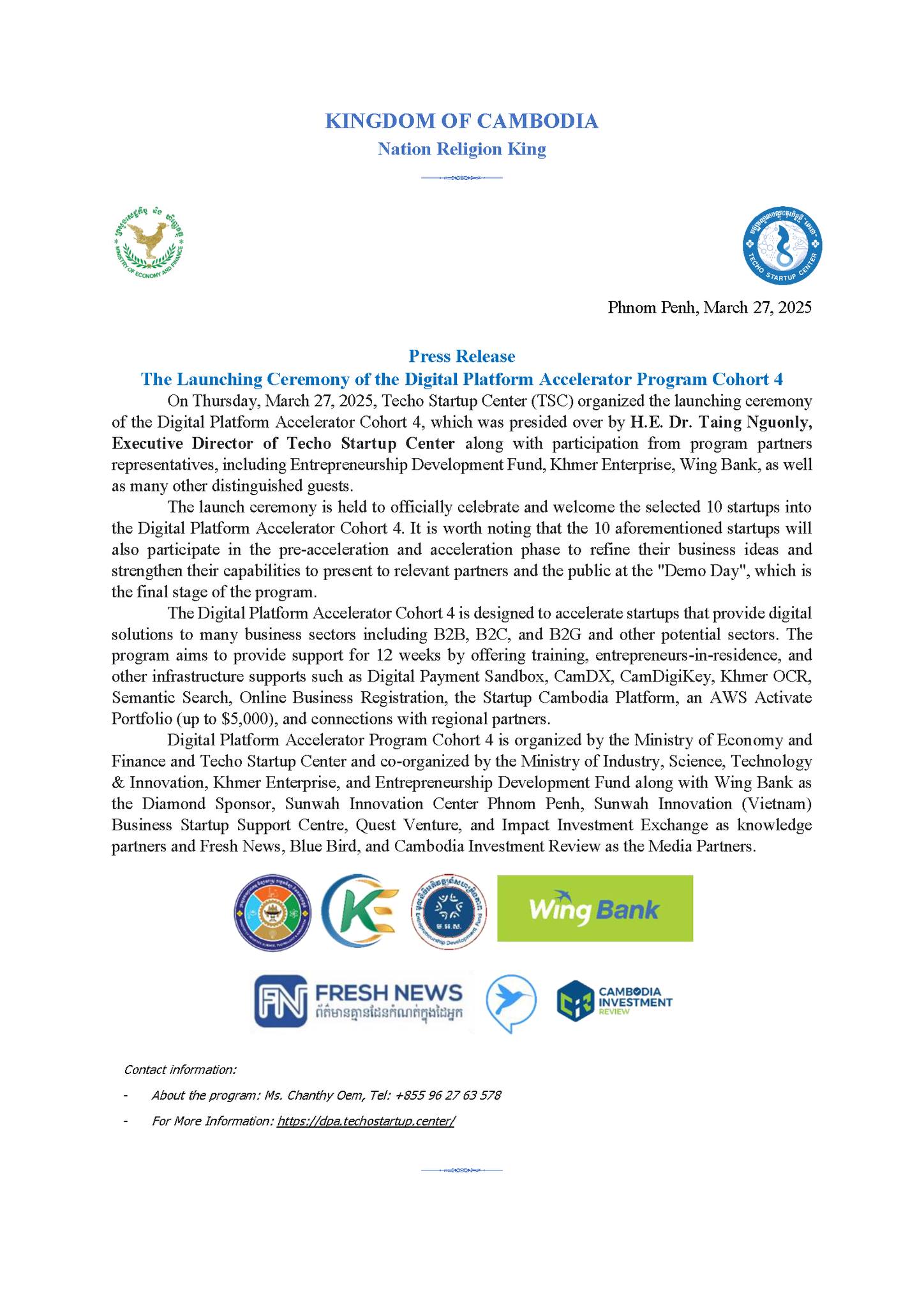 On 27 March 2025, Techo Startup Center issued a press release on the launching ceremony of the digital platform accelerator program cohort 4, which was presided over by H.E. Dr. Taing Nguonly, Executive Director of Techo Startup Center, along with participation from program partners, including Entrepreneurship Development Fund, Khmer Enterprise, Wing Bank, as well as many other distinguished guests.
