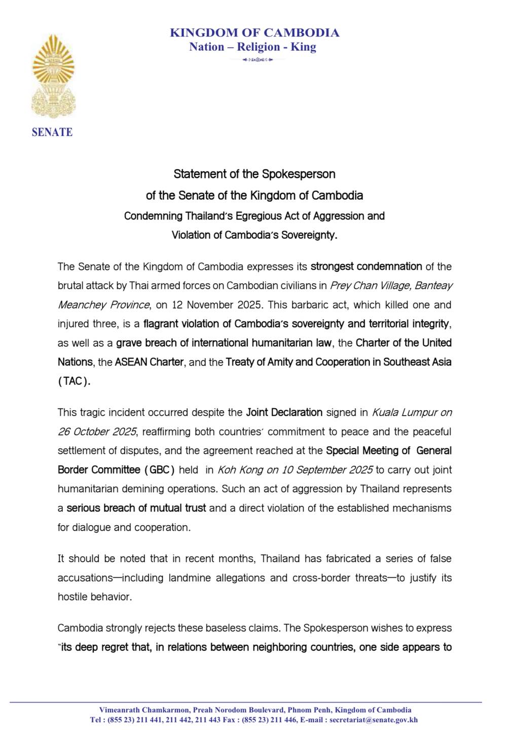 The Senate of the Kingdom of Cambodia issued its strongest condemnation of a brutal attack by Thai armed forces on Cambodian civilians in Prey Chan Village, Banteay Meanchey Province, on 12 November 2025, which killed one person and injured three.