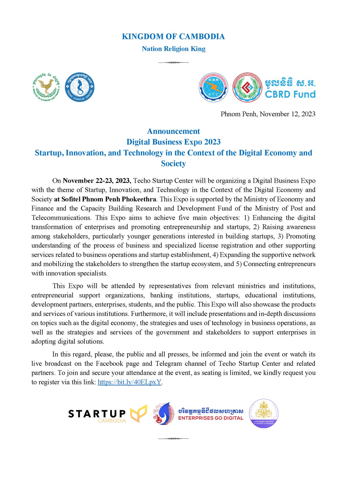 On 12 November 2023, Techo Startup Center issued an announcement on Digital Business Expo 2023 with the theme “Startup, Innovation, and Technology in the Context of the Digital Economy and Society”, which will be held on November 22-23, 2023. This Expo will be attended by ...
