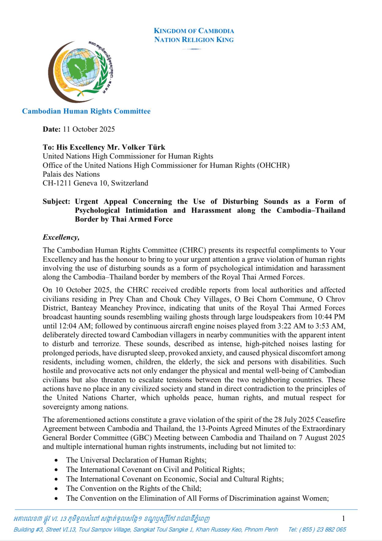 On 11 October 2025, the Cambodian Human Rights Committee (CHRC) submitted an appeal to the Office of the United Nations High Commissioner for Human Rights (OHCHR) in Geneva, Switzerland. The appeal concerned the Thai military’s use of high-pitched noise, described as haunting sounds resembling a ...