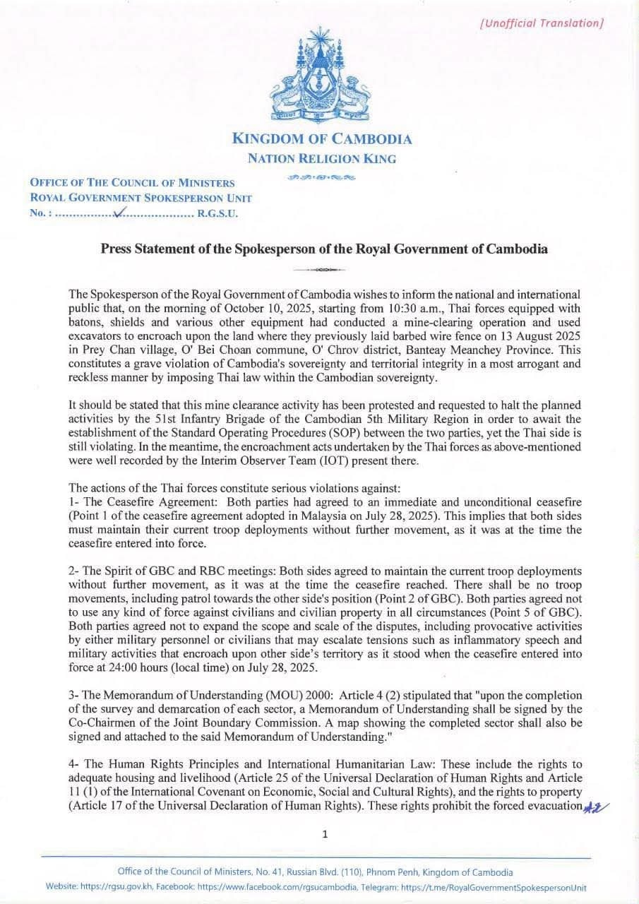 The Royal Government Spokesperson Unit (RGSU) of the Kingdom of Cambodia issued a press statement condemning the actions of Thai forces on the morning of 10 October 2025, for allegedly encroaching upon Cambodian territory in Prey Chan village, Banteay Meanchey Province, by conducting a mine-clearing ...