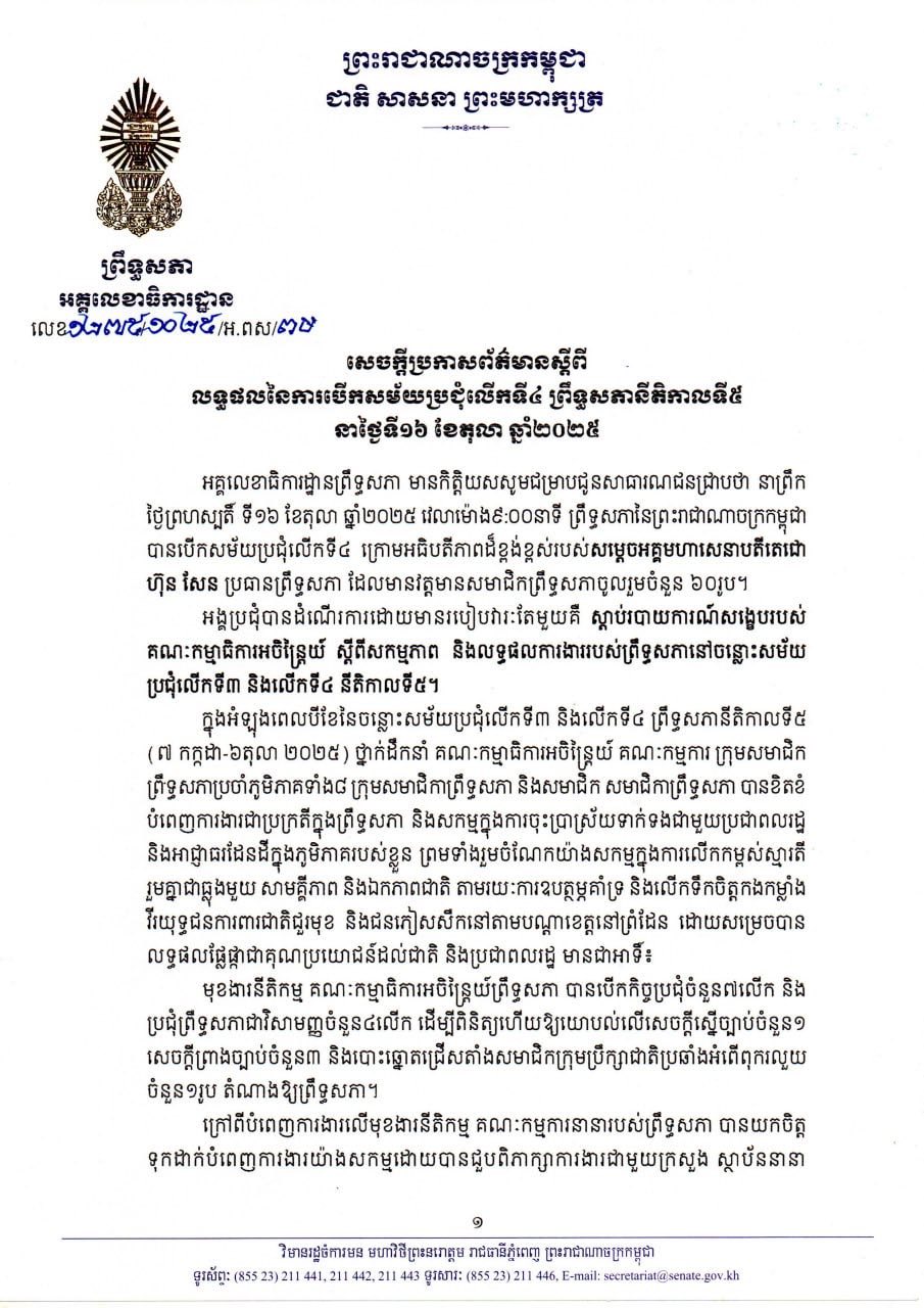 On 16 October 2025, the Secretariat General of the Senate issued a press release detailing the results of the 4th Session of the 5th Mandate, held under the presidency of Samdech Akka Moha Sena Padei Techo Hun Sen, President of the Senate, with 60 members ...