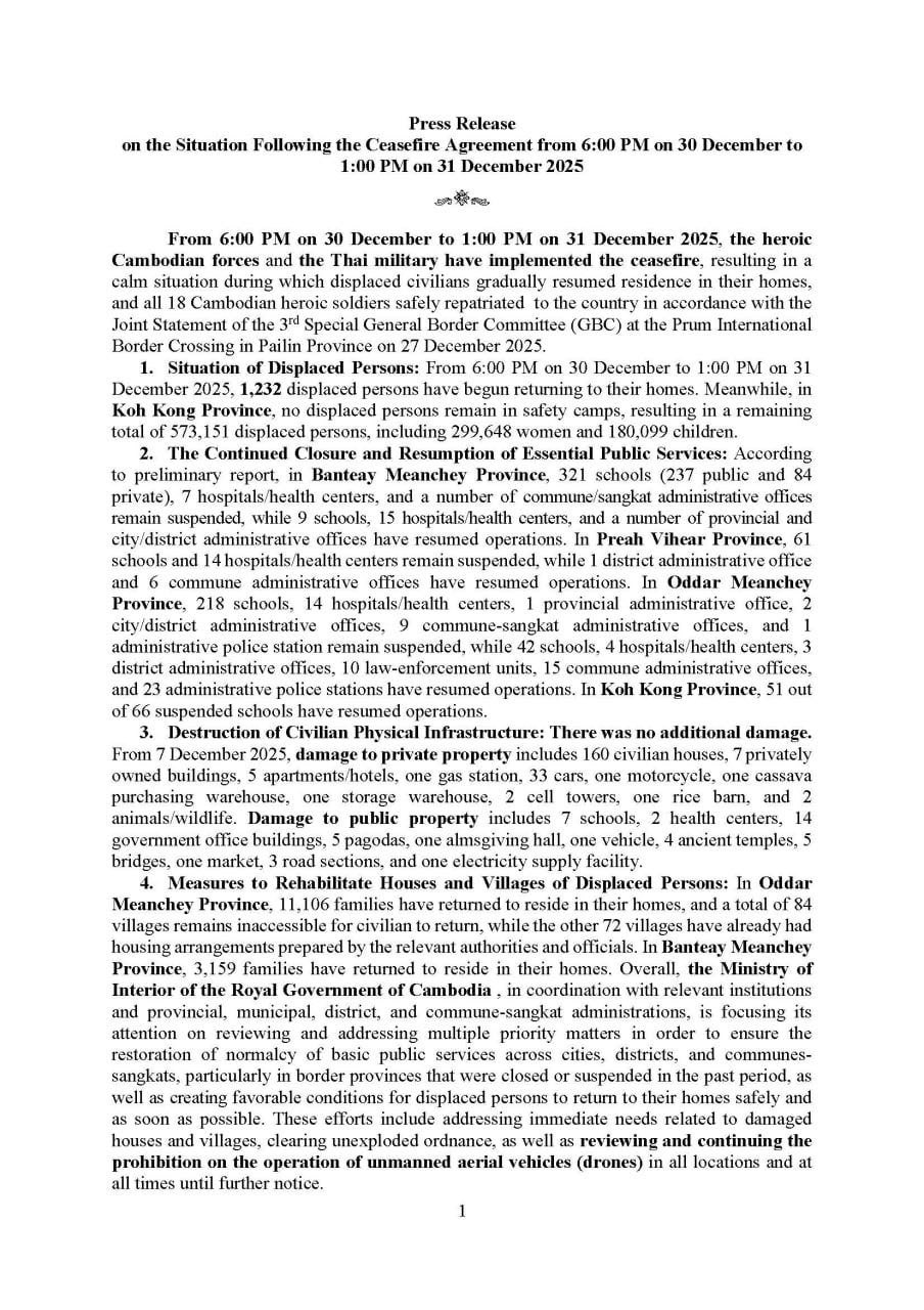 On 31 December 2025, the Ministry of Interior issued a press release regarding the situation following the ceasefire agreement from 6:00 PM on 30 December to 1:00 PM on 31 December 2025.To date, 1,232 displaced persons have begun returning to their homes, resulting in a ...
