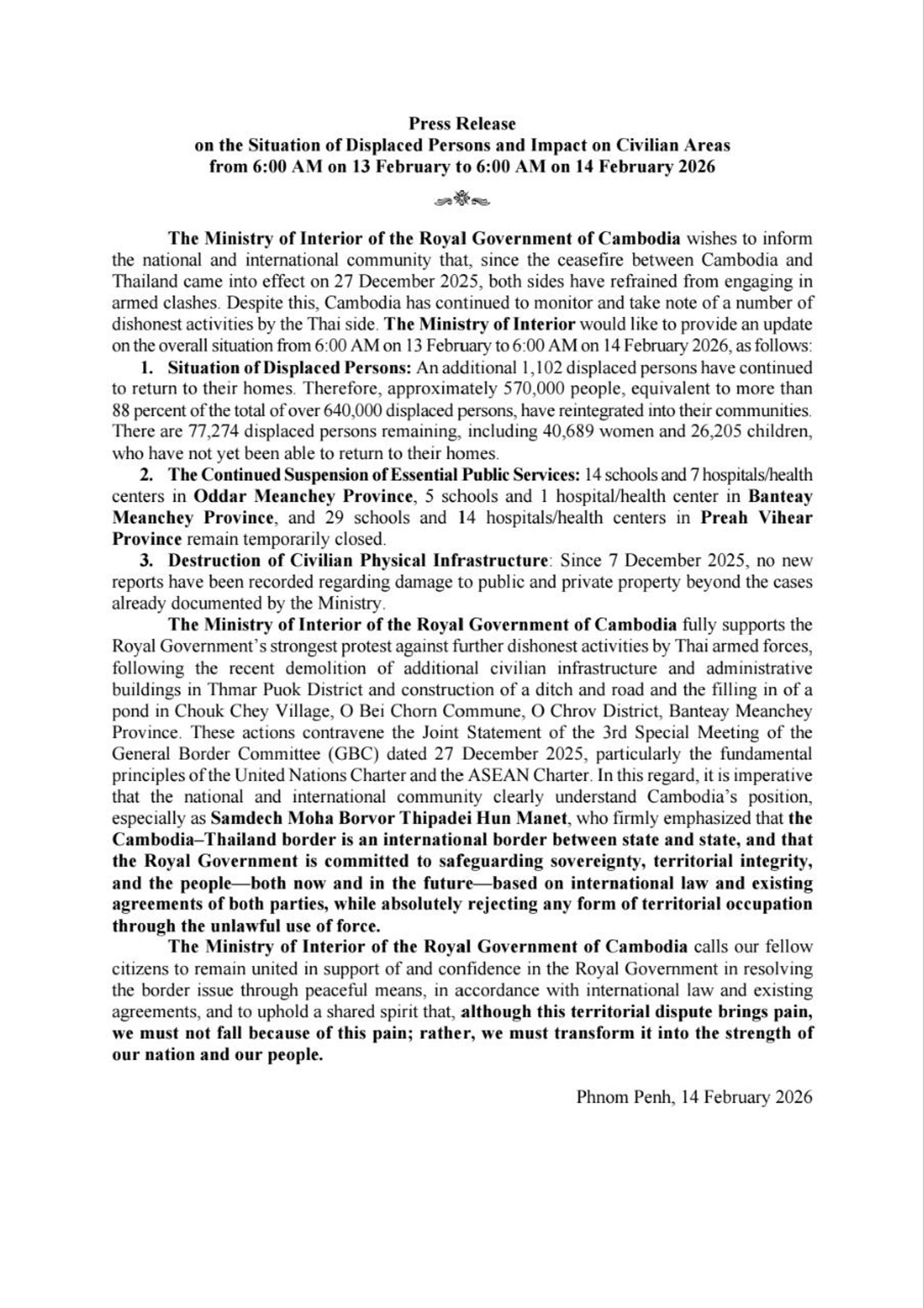 On 7 February 2026, the Ministry of Interior issued a press release on the situation following the ceasefire agreement from 6:00 AM on 6 February to 6:00 AM on 7 February 2026 and the position of the Ministry of Interior of the Royal Government of ...