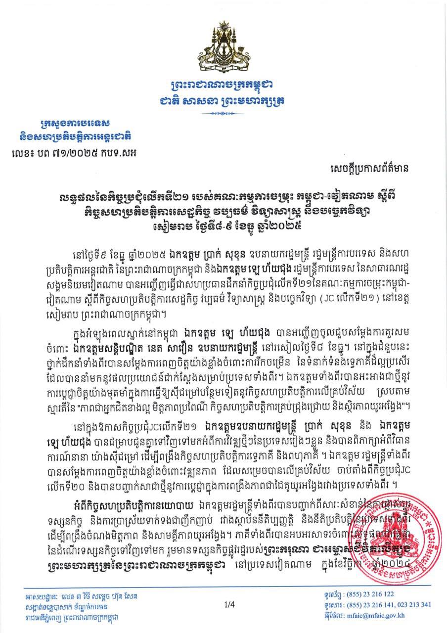 នៅថ្ងៃទី១១ ខែធ្នូ ឆ្នាំ២០២៥ ក្រសួងការបរទេស និងសហប្រតិបត្តិការអន្តរជាតិ បានចេញសេចក្ដីប្រកាសព័ត៌មាន ស្ដីពី លទ្ធផលនៃកិច្ចប្រជុំលើកទី២១ របស់គណៈកម្មការចម្រុះ កម្ពុជា-វៀតណាម ស្តីពីកិច្ចសហប្រតិបត្តិការសេដ្ឋកិច្ច វប្បធម៌ វិទ្យាសាស្រ្ត និងបច្ចេកវិទ្យា។នៅក្នុងឱកាសកិច្ចប្រជុំJCលើកទី២១ ឯកឧត្តមឧបនាយករដ្ឋមន្ត្រី ប្រាក់ សុខុន និង ឯកឧត្តម ឡេ ហ័យជុង បានជម្រាបជូនគ្នាទៅវិញទៅមកអំពីការវិវឌ្ឍថ្មីៗនៃប្រទេសរៀងៗខ្លួន និងបានពិភាក្សាអំពីវិធានការណ៍នានាយ៉ាងស៊ីជម្រៅដើម្បីពង្រឹងកិច្ចសហប្រតិបត្តិការទ្វេភាគី និងពហុភាគី។ ...