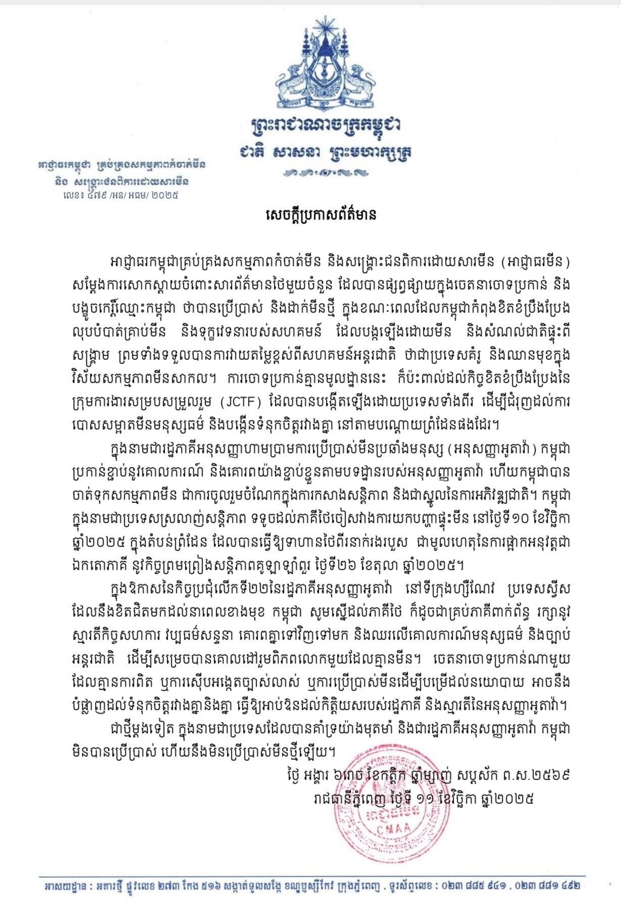 On 11 November 2025, the Cambodian Mine Action and Victim Assistance Authority (CMAA) issued a press release, expressing deep regret and strongly rejecting recent “unfounded and defamatory” reports by certain Thai media outlets accusing Cambodia of laying new landmines along the border.The CMAA views these ...