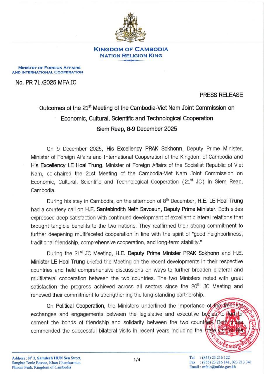 On 11 December 2025, the Ministry of Foreign Affairs and International Cooperation issued a press release on the outcomes of the 21st meeting of the Cambodia-Viet Nam joint commission on economic, cultural, scientific, and technological cooperation.During the 21st JC Meeting, H.E. Deputy Prime Minister PRAK ...