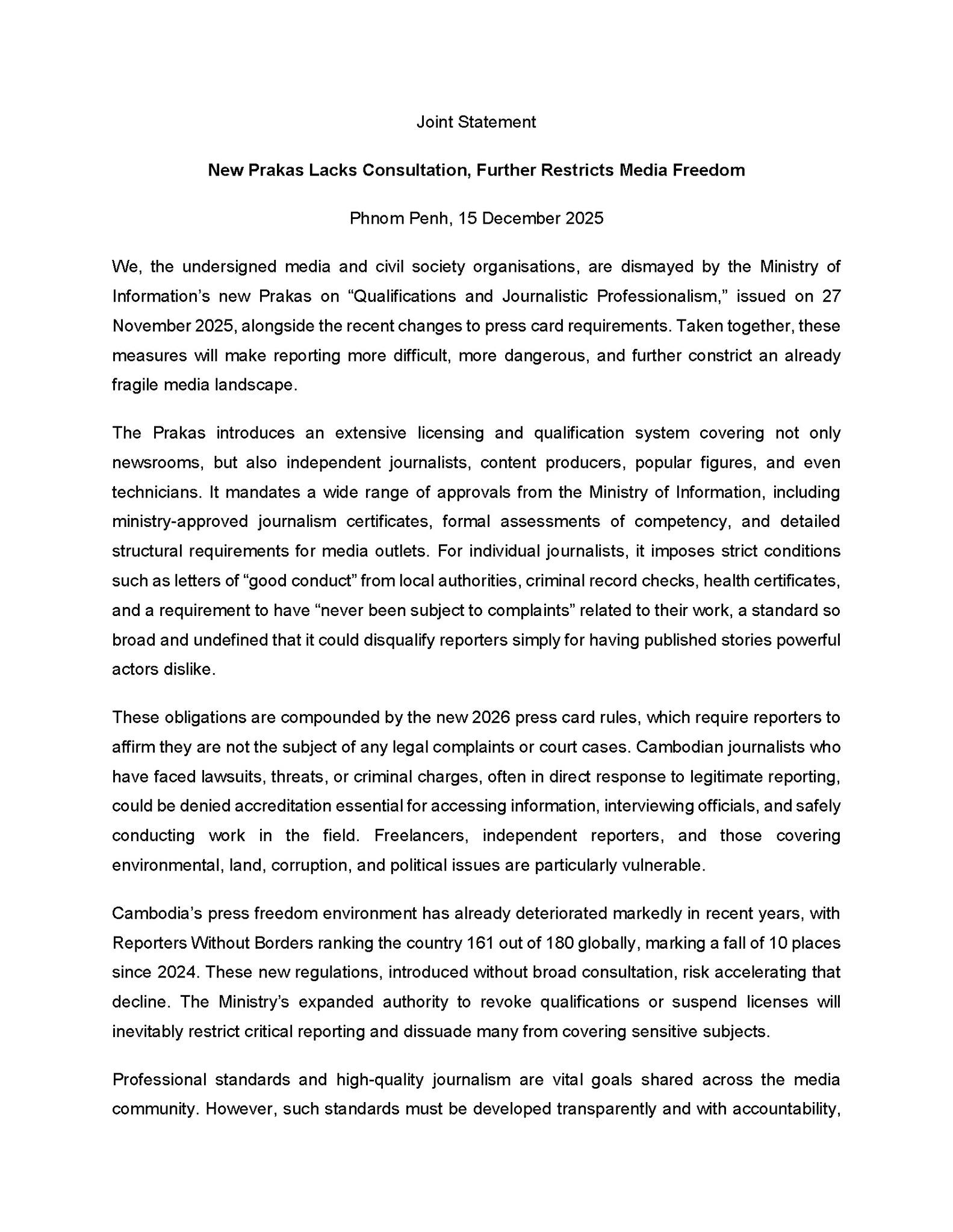 On 15 December 2025, a network of journalists and civil society groups issued a statement expressing deep regret over the Ministry of Information’s new regulation on “Qualifications and Professional Ethics for Information and Audiovisual Practitioners” and changes to press card requirements. These groups are concerned ...