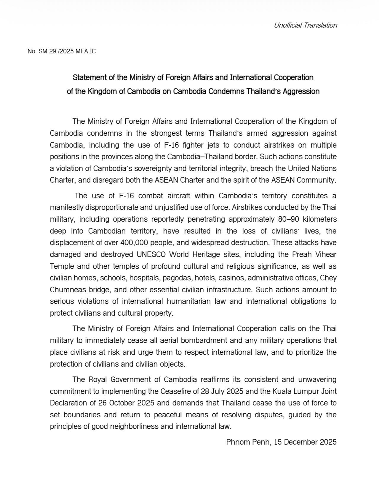 On 15 December 2025, the Ministry of Foreign Affairs and International Cooperation issued a statement to condemn Thailand’s aggression.The Ministry of Foreign Affairs and International Cooperation of the Kingdom of Cambodia condemns in the strongest terms Thailand’s armed aggression against Cambodia, including the use of ...
