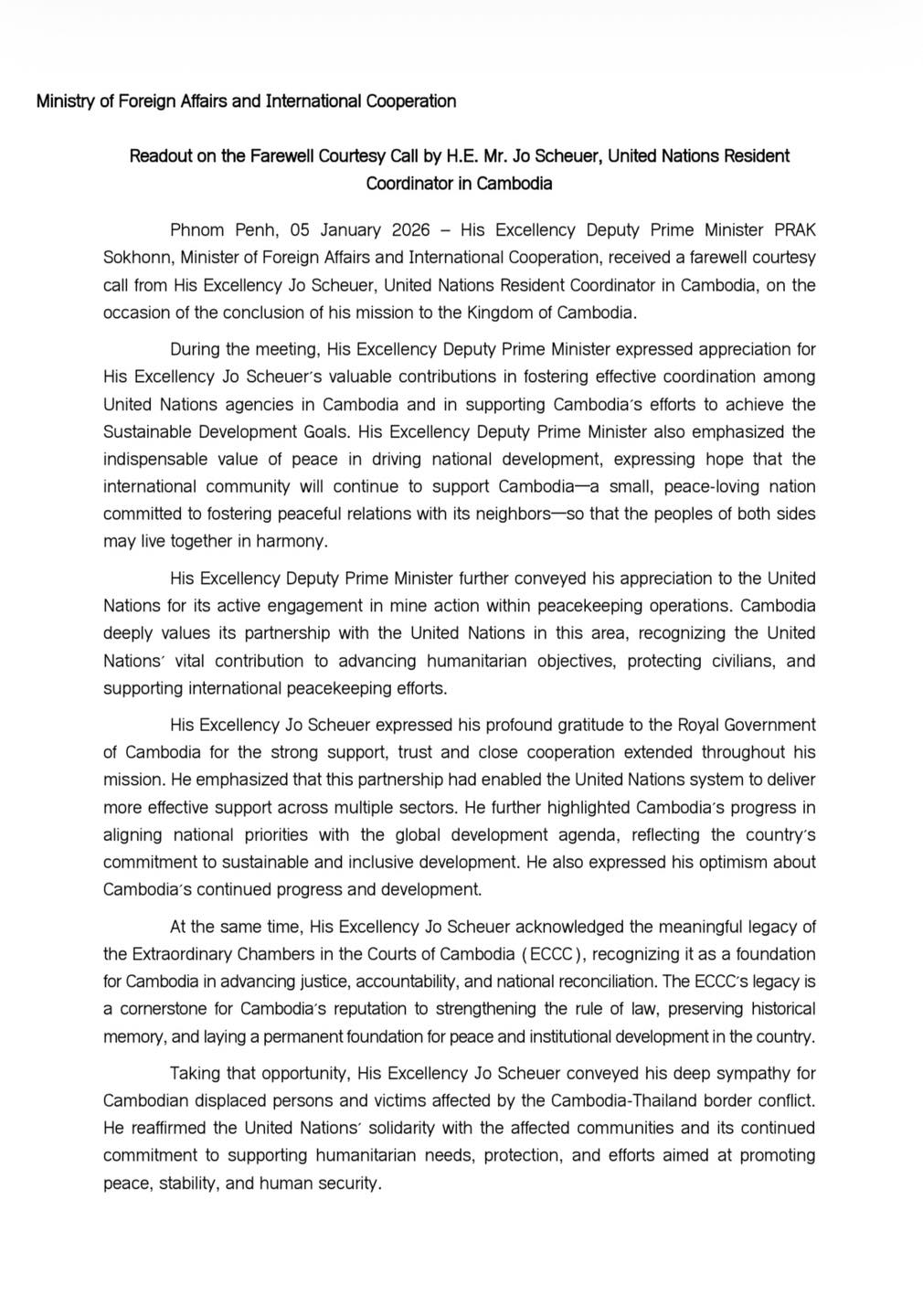 On 5 January 2026, the Ministry of Foreign Affairs and International Cooperation issued a readout on the farewell courtesy call by H.E. Mr. Jo Scheuer, United Nations Resident Coordinator in Cambodia.During the meeting, His Excellency Deputy Prime Minister expressed appreciation for His Excellency Jo Scheuer’s ...