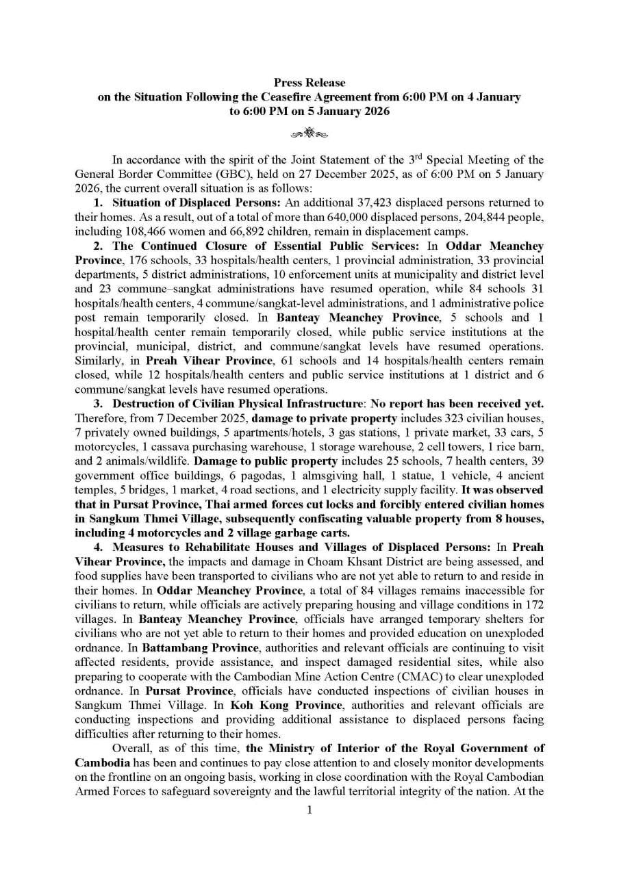 On 5 January 2026, the Ministry of Interior issued a press release regarding the situation following the ceasefire agreement from 6:00 PM on 4 January to 6:00 PM on 5 January 2026.From 6:00 PM on 4 January to 6:00 PM on 5 January 2026, an ...