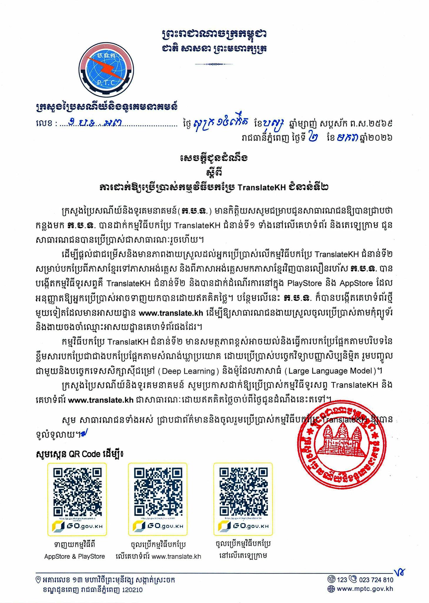 On 2 January 2026, the Ministry of Posts and Telecommunications issued an announcement on the launch of the TranslateKH 2nd generation app.The 2nd generation of TranslatKH is highly capable of understanding and translating based on the context of translation content rather than sentence construction, using ...