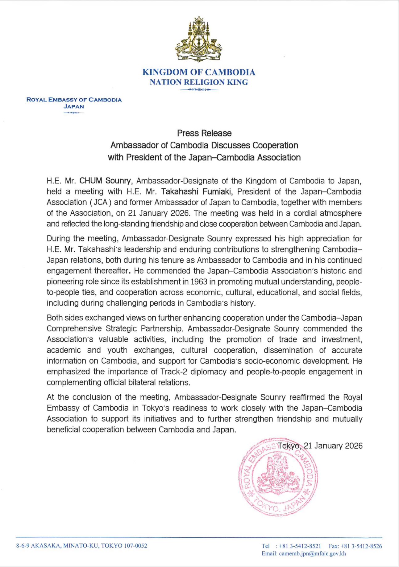On 21 January 2026, the Royal Embassy of Cambodia in Japan issued a press release on His Excellency Mr. CHUM Sounry, Ambassador-Designate of the Kingdom of Cambodia to Japan, holding a meeting with His Excellency Mr. Takahashi Fumiaki, President of the Japan-Cambodia Association (JCA) and ...