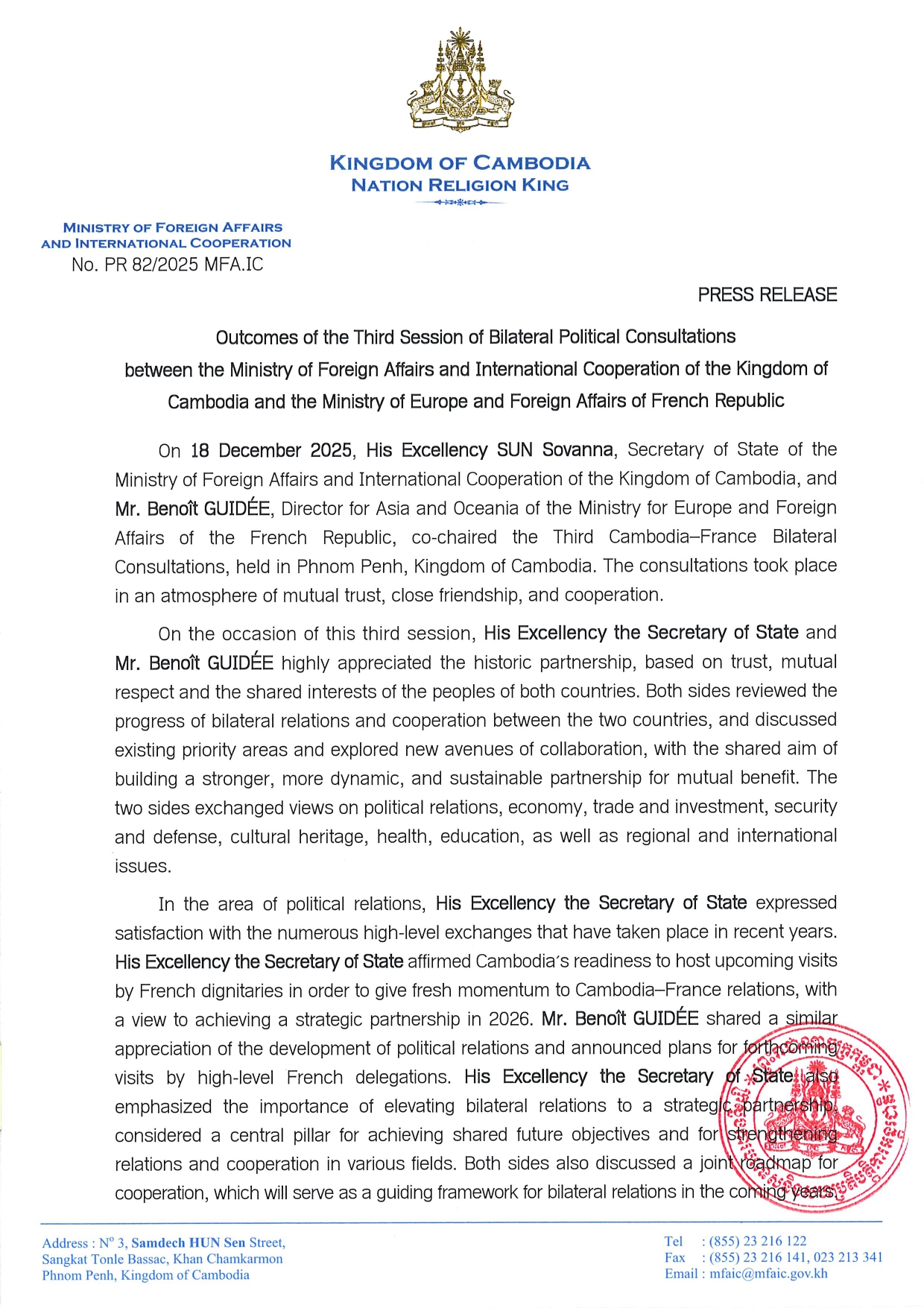 On 19 December 2025, the Ministry of Foreign Affairs and International Cooperation issued a press release on the courtesy call on His Excellency PRAK Sokhonn, Deputy Prime Minister and Minister of Foreign Affairs and International Cooperation by Mr. Benoît GUIDÉE, Director for Asia and Oceania ...