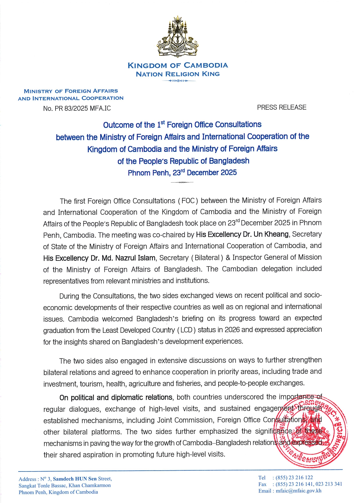 On 15 December 2025, the Ministry of Foreign Affairs and International Cooperation issued a press release on the outcomes of the 3rd session of bilateral political consultations between the Ministry of Foreign Affairs and International Cooperation of the Kingdom of Cambodia and the Foreign, Commonwealth ...