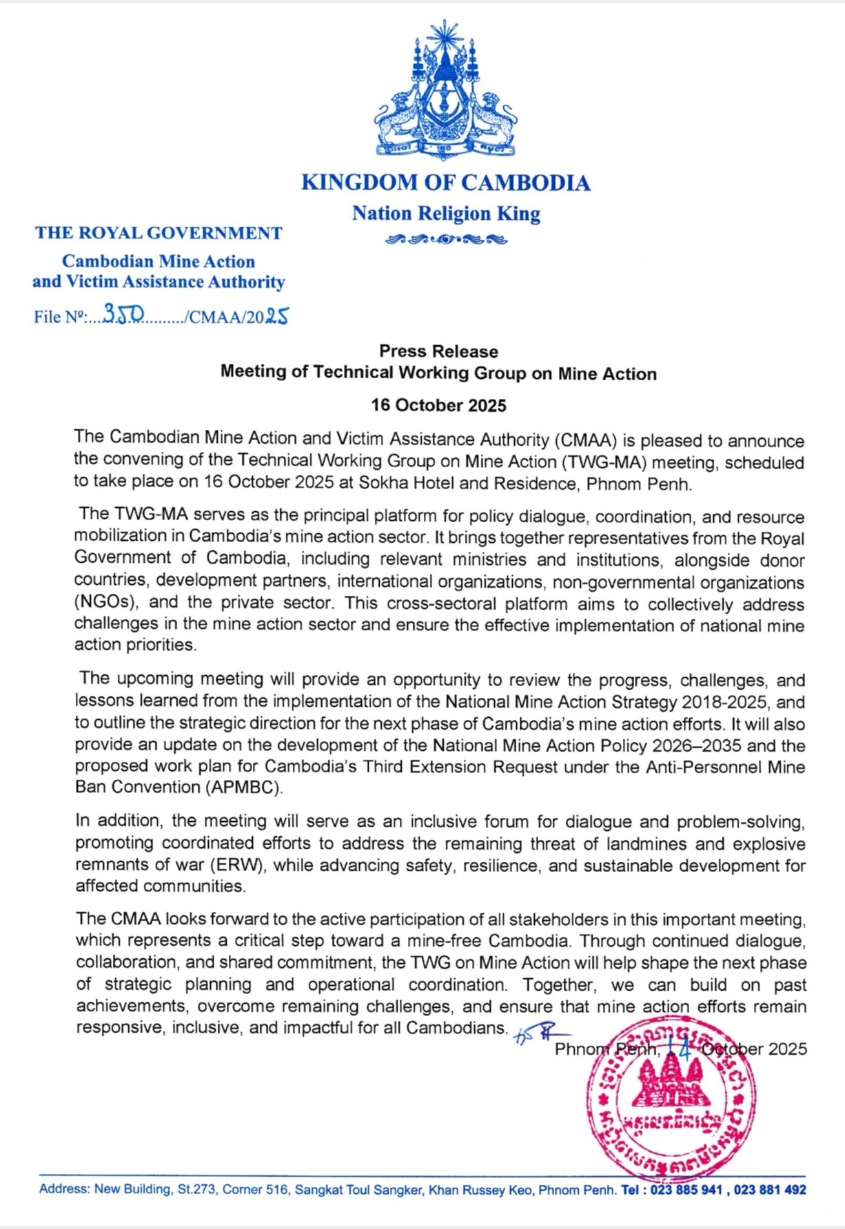 On 14 October 2025, the Cambodian Mine Action and Victim Assistance Authority (CMAA) announced the convening of the Technical Working Group on Mine Action (TWG-MA) meeting, scheduled to take place on 16 October 2025 at Sokha Hotel and Residence, Phnom Penh.The meeting will provide an ...