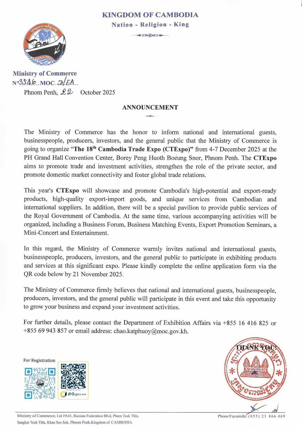 On 22 October 2025, the Ministry of Commerce issued an announcement on the 18th Cambodia Trade Expo-CTExpo from 4-7 December 2025 at the PH Grand Hall Convention Center, Borey Peng Huoth Boeung Snor, Phnom Penh. The CTExpo aims to promote trade and investment activities, strengthen ...