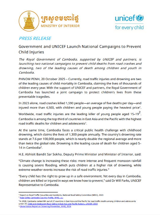 On 20 October 2025, UNICEF issued a press release on the national campaigns to prevent child injuries. The Royal Government of Cambodia, supported by UNICEF and partners, is launching two national campaigns to prevent child deaths from road crashes and drowning, two of the leading ...