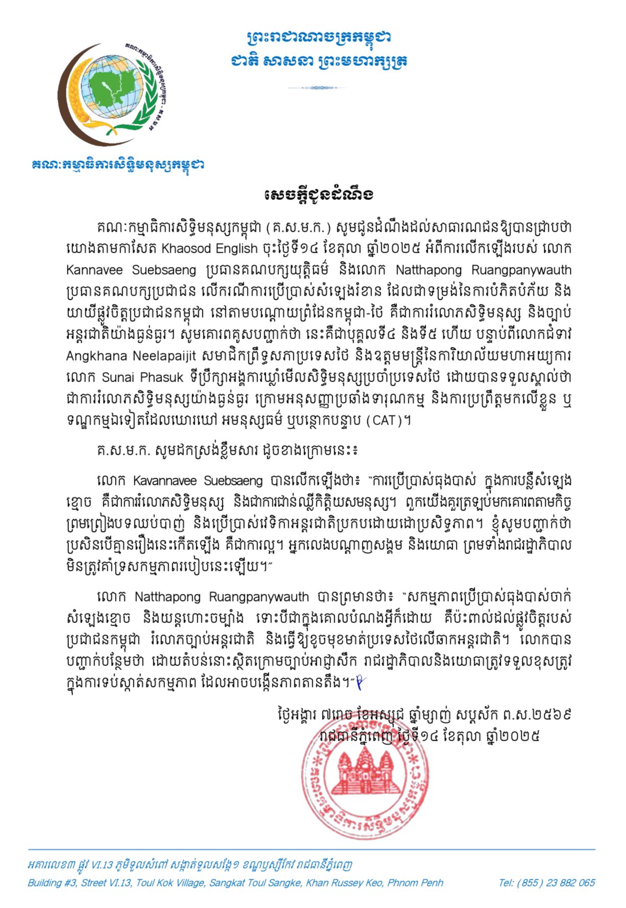 នៅថ្ងៃទី១៤ ខែតុលា ឆ្នាំ២០២៥ គណៈកម្មាធិការសិទ្ធិមនុស្សកម្ពុជា (គ.ស.ម.ក.) បានជូនដំណឹងដល់សាធារណជន ដោយស្រង់សំដីរបស់ប្រធានគណបក្សនយោបាយថៃចំនួនពីររូប គឺលោក Kavannavee Suebseang ប្រធានគណបក្សយុត្តិធម៌ និងលោក ...