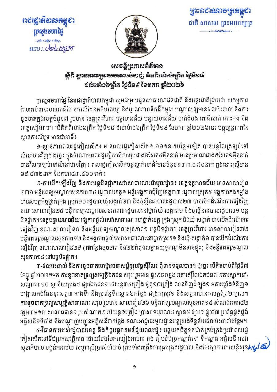 សេចក្ដីប្រកាសព័ត៌មាន៖ ស្ថានភាពក្រោយបទឈប់បាញ់ គិតពីម៉ោង៦ព្រឹក ថ្ងៃទី១៨ ដល់ម៉ោង៦ព្រឹក ថ្ងៃទី១៩ ខែមករា ឆ្នាំ២០២៦