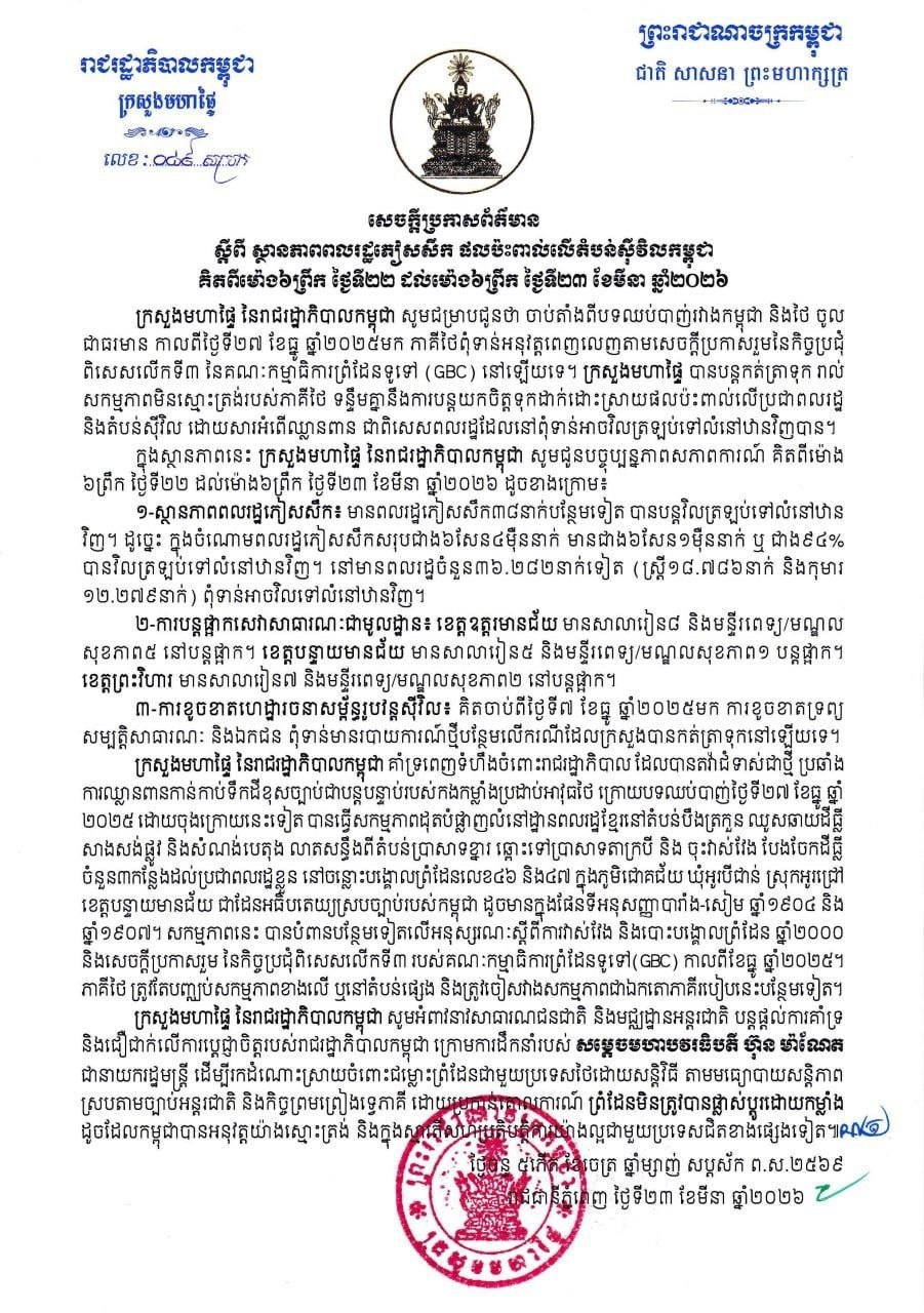 • នៅថ្ងៃទី២០ ខែមីនា ឆ្នាំ២០២៦ ក្រសួងការបរទេស និងសហប្រតិបត្តិការអន្តរជាតិ បានចេញសេចក្តីប្រកាសព័ត៌មានស្ដីពីការតវ៉ាប្រឆាំងនឹងសកម្មភាពឈ្លានពាន និងការកាន់កាប់ដោយខុសច្បាប់របស់ភាគីថៃ។កាលពីចុងសប្តាហ៍នេះ កម្ពុជាបានធ្វើការតវ៉ាជាផ្លូវការបន្ថែមថ្មីទៀតប្រឆាំងនឹងការបន្តសកម្មភាពរំលោភ លើអធិបតេយ្យភាព និងបូរណភាពទឹកដីរបស់កម្ពុជា ដោយកងកម្លាំងប្រដាប់អាវុធថៃ ក្រោយបទឈប់បាញ់ នៅថ្ងៃទី២៧ ខែធ្នូ ឆ្នាំ២០២៥។  ...