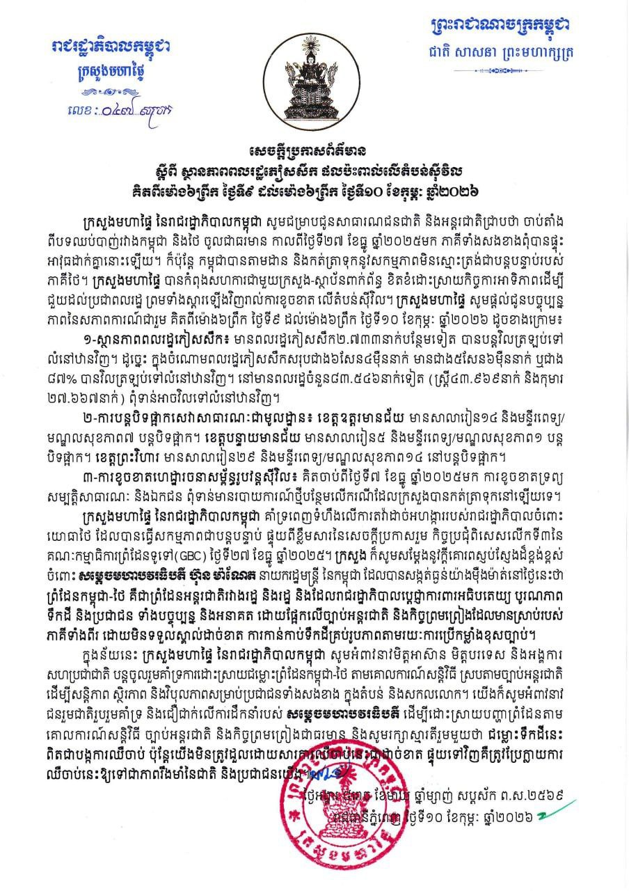 • នៅ​ថ្ងៃទី១០ ខែកុម្ភៈ​ ឆ្នាំ​២០២៦​ ក្រសួងមហាផ្ទៃ បានចេញសេចក្ដីប្រកាសព័ត៌មាន ស្ដីពី ស្ថានភាពពលរដ្ឋភៀសសឹក​​ ផលប៉ះពាល់តំបន់សុីវិល គិតពីម៉ោង៦ព្រឹក ថ្ងៃទី៩ ដល់ម៉ោង៦ព្រឹក ថ្ងៃទី១០ ខែកុម្ភៈ ឆ្នាំ២០២៦។គិតត្រឹមព្រឹកថ្ងៃទី១០ ខែកុម្ភៈ ឆ្នាំ២០២៦ មានពលរដ្ឋភៀសសឹក២.៧៣៣នាក់បន្ថែមទៀត បានបន្តវិលត្រឡប់ទៅលំនៅឋានវិញ។ ដូច្នេះ ក្នុងចំណោមពលរដ្ឋភៀសសឹកសរុបជាង៦សែន៤ម៉ឺននាក់ មានជាង៥សែន៦ម៉ឺននាក់ ឬជាង៨៧% បានវិលត្រឡប់ទៅលំនៅឋានវិញ។ នៅមានពលរដ្ឋចំនួន៨៣.៥៤៦នាក់ទៀត (ស្រី្ត៤៣.៩៦៩នាក់ និងកុមារ២៧.៦៦៧នាក់) ពុំទាន់អាចវិលទៅលំនៅឋានវិញ។ ...