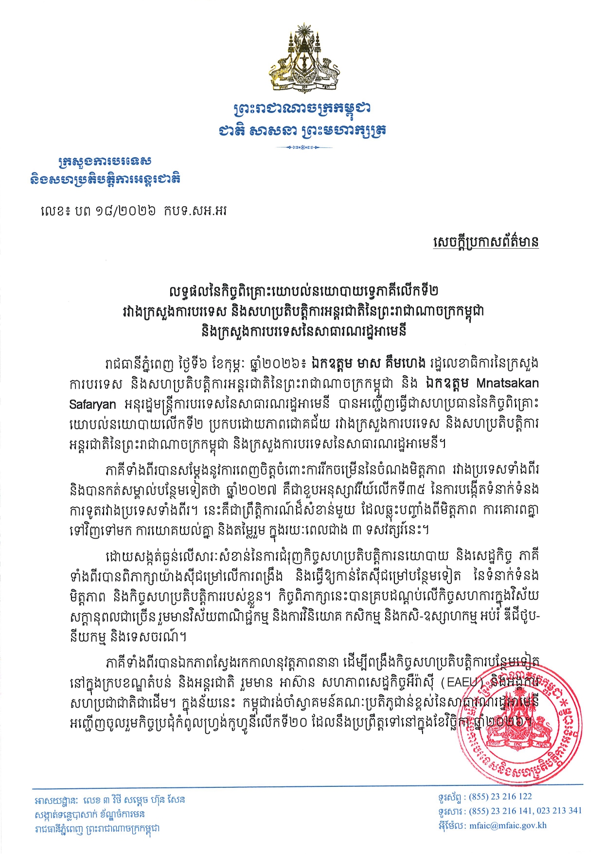 • សេចក្ដីប្រកាសព័ត៌មាន៖ ស្ថានភាពពលរដ្ឋភៀសសឹក​​ ផលប៉ះពាល់តំបន់សុីវិល គិតពីម៉ោង៦ព្រឹក ថ្ងៃទី៩ ដល់ម៉ោង៦ព្រឹក ថ្ងៃទី១០ ខែកុម្ភៈ ឆ្នាំ២០២៦