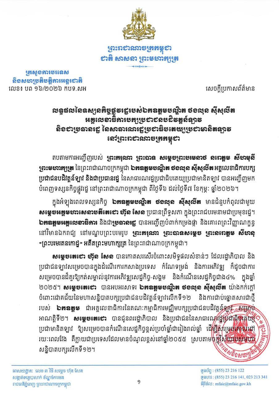នៅថ្ងៃទី៧ ខែកុម្ភៈ ឆ្នាំ២០២៦ ក្រសួងការបរទេស និងសហប្រតិបត្តិការអន្តរជាតិ បានចេញសេចក្តីប្រកាសព័ត៌មាន ស្ដីពី លទ្ធផលនៃទស្សនកិច្ចផ្លូវរដ្ឋរបស់ឯកឧត្តមបណ្ឌិត ថងលុន ស៊ីសុលីត អគ្គលេខាធិការបក្សប្រជាជនបដិវត្តន៍ឡាវ និងជាប្រធានរដ្ឋនៃសាធារណរដ្ឋប្រជាធិបតេយ្យប្រជាមានិតឡាវ នៅព្រះរាជាណាចក្រកម្ពុជា។ថ្នាក់ដឹកនាំទាំងពីរ បានសម្តែងនូវការពេញចិត្តចំពោះការរីកចម្រើនជាវិជ្ជមាននៃទំនាក់ទំនងជិតស្និទ្ធ និងកិច្ចសហប្រតិបត្តិការលើគ្រប់វិស័យរវាងកម្ពុជានិងឡាវក្នុងរយៈពេលកន្លងមកនេះដែលបាននាំមកនូវផលប្រយោជន៍រួមជាក់ស្តែងសម្រាប់ប្រជាជននៃប្រទេសទាំងពីរ។ ...