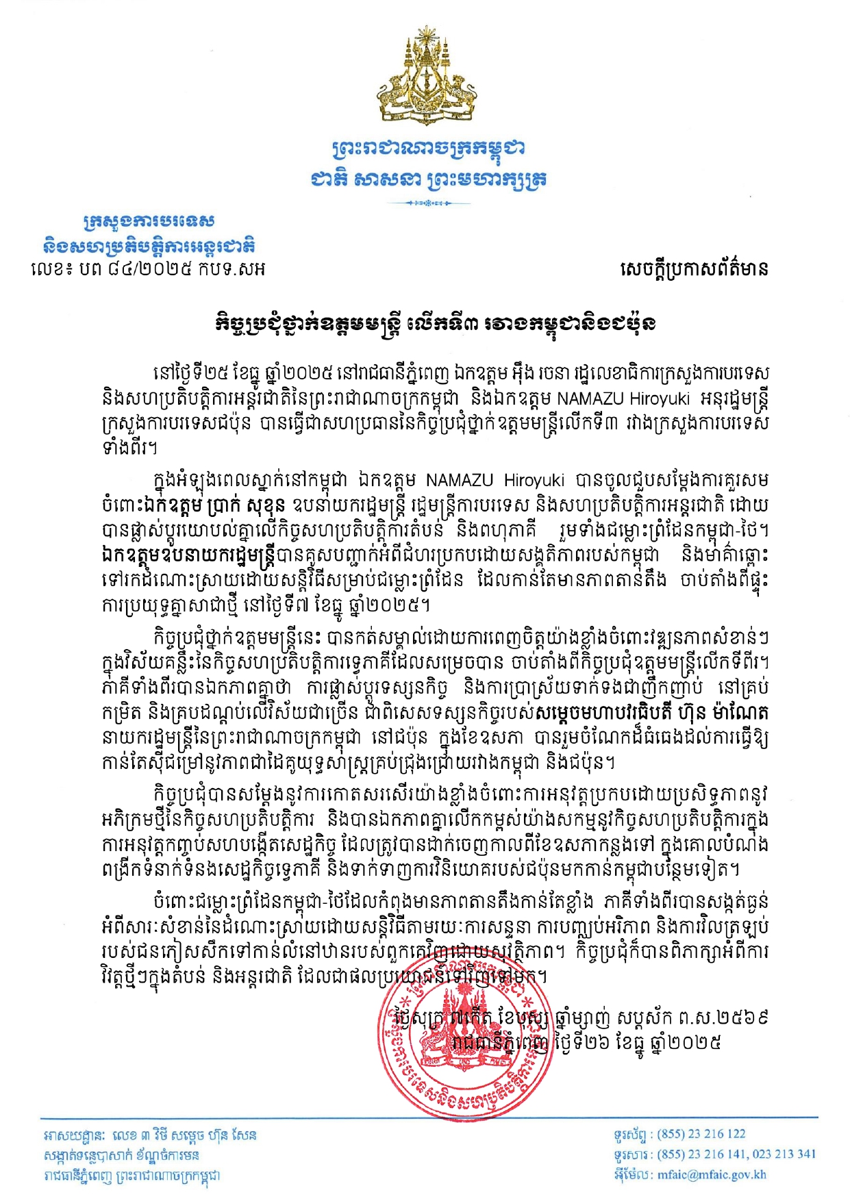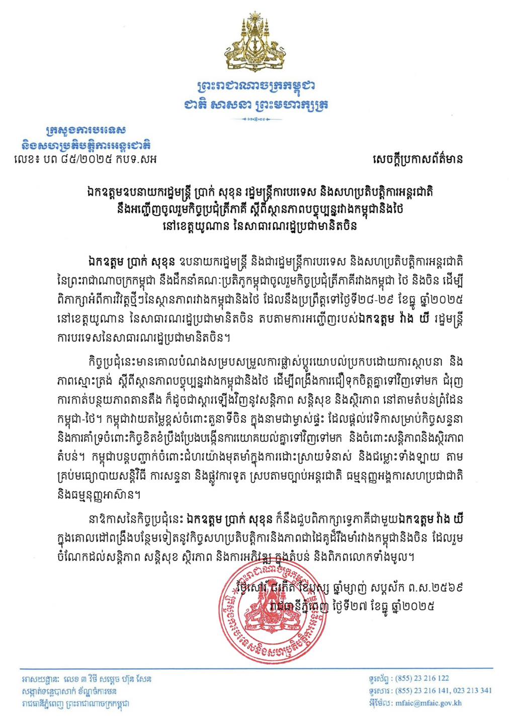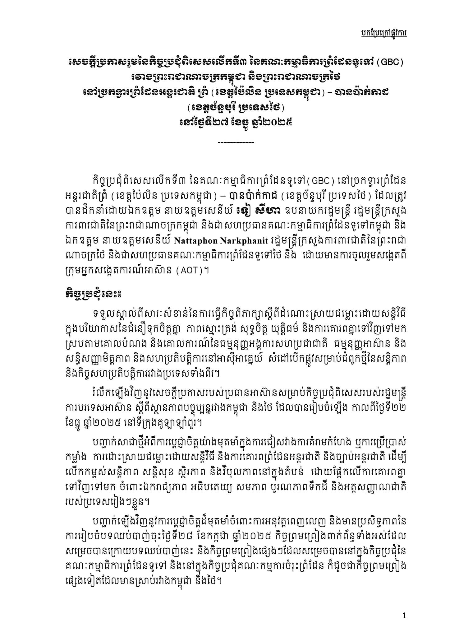 • នៅថ្ងៃទី២៦ ខែធ្នូ ឆ្នាំ២០២៥ អាជ្ញាធរកម្ពុជា គ្រប់គ្រងសកម្មភាពកំចាត់មីន និង សង្គ្រោះជនពិការរដោយសារមីន បានចេញសេចក្តីណែនាំ ស្តីពី ការពង្រឹងវិធានការសុវត្ថិភាពចំពោះប្រតិបត្តិការសកម្មភាពមីន និងការអប់រំផ្សព្វផ្សាយការយល់ដឹងពីយុទ្ធភណ្ឌគ្រឿងផ្ទុះអំឡុងពេលឈ្លានពានរបស់យោធាថៃមកលើកម្ពុជា។ការឈ្លានពានដោយប្រើប្រាស់យុទ្ធោបករណ៍ទាំងនោះ បានបណ្តាលឱ្យប្រជាជនស៊ីវិលស្លាប់ និងរបួសជាច្រើននាក់ បំផ្លិចបំផ្លាញទ្រព្យសម្បត្តិនិងហេដ្ឋារចនាសម្ព័ន្ធសាធារណៈ មណ្ឌលសុខភាព សាលារៀន វត្តអារាម ប្រាសាទបុរាណ និងបានបង្ខំឱ្យប្រជាជនប្រមាណជាង ២០ម៉ឺនគ្រួសារ ត្រូវជម្លៀសចេញពីលំនៅដ្ឋានទៅកាន់ទីតាំងសុវត្ថិភាពជាច្រើនកន្លែងតាមបណ្តាខេត្តនានា។ ...