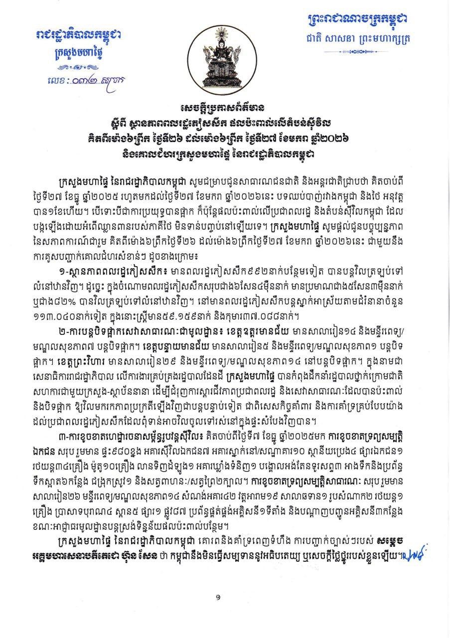 សេចក្ដីប្រកាសព័ត៌មាន៖ ស្ថានភាពក្រោយបទឈប់បាញ់ គិតពីម៉ោង៦ព្រឹក ថ្ងៃទី២៦ ដល់ម៉ោង៦ព្រឹក ថ្ងៃទី២៧ ខែមករា ឆ្នាំ២០២៦
