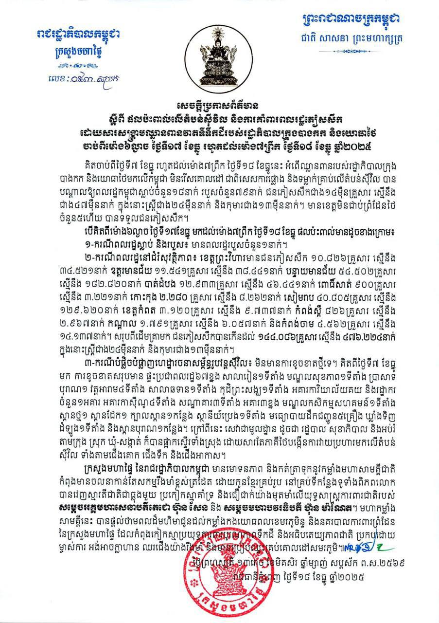 នៅថ្ងៃទី១៨ ខែធ្នូ ឆ្នាំ២០២៥ ក្រសួងមហាផ្ទៃ ចេញសេចក្ដីប្រកាសព័ត៌មាន ស្ដីពី ផលប៉ះពាល់លើតំបន់ស៊ីវិល និងការគាំពារពលរដ្ឋភៀសសឹក ដោយសារសង្គ្រាមឈ្លានពានវាតទីទឹកដីរបស់រដ្ឋាភិបាលក្រុងបាងកក និងយោធាថៃ ចាប់ពីម៉ោង៦ល្ងាច ថ្ងៃទី១៧ ខែធ្នូ រហូតដល់ម៉ោង៧ព្រឹក ថ្ងៃទី១៨ ខែធ្នូ ឆ្នាំ២០២៥។គិតចាប់ពីថ្ងៃទី៧ ខែធ្នូ រហូតដល់ម៉ោង៧ព្រឹក ថ្ងៃទី១៨ ខែធ្នូនេះ អំពើឈ្លានពានរបស់រដ្ឋាភិបាលក្រុងបាងកក និងយោធាថៃ មកលើកម្ពុជា មិនរើសគោលដៅ ជាពិសេសការផ្លោងនិងទម្លាក់គ្រាប់លើតំបន់ស៊ីវិល បានបណ្ដាលឱ្យពលរដ្ឋកម្ពុជាស្លាប់ចំនួន១៨នាក់ របួសចំនួន៧៩នាក់ ជនភៀសសឹកជាង១៤ម៉ឺនគ្រួសារ។ ...