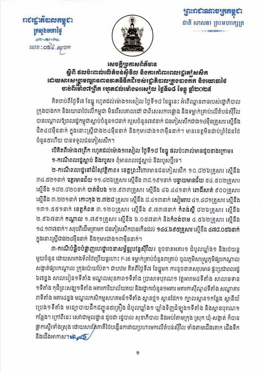 នៅថ្ងៃទី១៨ ខែធ្នូ ឆ្នាំ២០២៥ ក្រសួងមហាផ្ទៃ ចេញសេចក្ដីប្រកាសព័ត៌មាន ស្ដីពី ផលប៉ះពាល់លើតំបន់ស៊ីវិល និងការគាំពារពលរដ្ឋភៀសសឹក ដោយសារសង្គ្រាមឈ្លានពានវាតទីទឹកដីរបស់រដ្ឋាភិបាលក្រុងបាងកក និងយោធាថៃ ចាប់ពីម៉ោង៦ល្ងាច ថ្ងៃទី១៧ ខែធ្នូ រហូតដល់ម៉ោង៧ព្រឹក ថ្ងៃទី១៨ ខែធ្នូ ឆ្នាំ២០២៥។គិតចាប់ពីថ្ងៃទី៧ ខែធ្នូ រហូតដល់ម៉ោង៧ព្រឹក ថ្ងៃទី១៨ ខែធ្នូនេះ អំពើឈ្លានពានរបស់រដ្ឋាភិបាលក្រុងបាងកក និងយោធាថៃ មកលើកម្ពុជា មិនរើសគោលដៅ ជាពិសេសការផ្លោងនិងទម្លាក់គ្រាប់លើតំបន់ស៊ីវិល បានបណ្ដាលឱ្យពលរដ្ឋកម្ពុជាស្លាប់ចំនួន១៨នាក់ របួសចំនួន៧៩នាក់ ជនភៀសសឹកជាង១៤ម៉ឺនគ្រួសារ។ ...