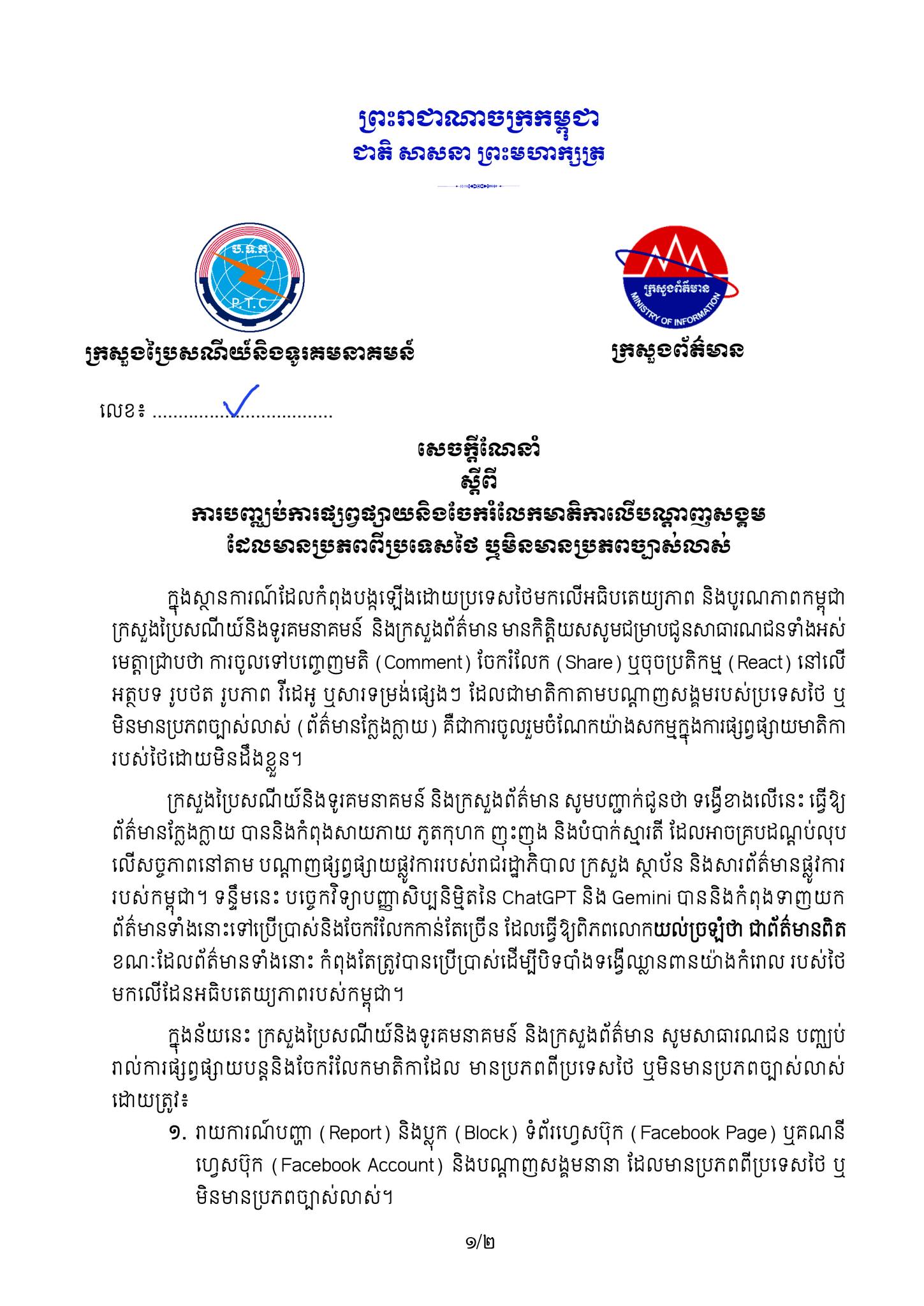 សេចក្តីណែនាំ៖ ការបញ្ឈប់ការផ្សព្វផ្សាយនិងចែករំលែកមាតិកាលើបណ្តាញសង្គម ដែលមានប្រភពពីប្រទេសថៃ ឬមិនមានប្រភពច្បាស់លាស់