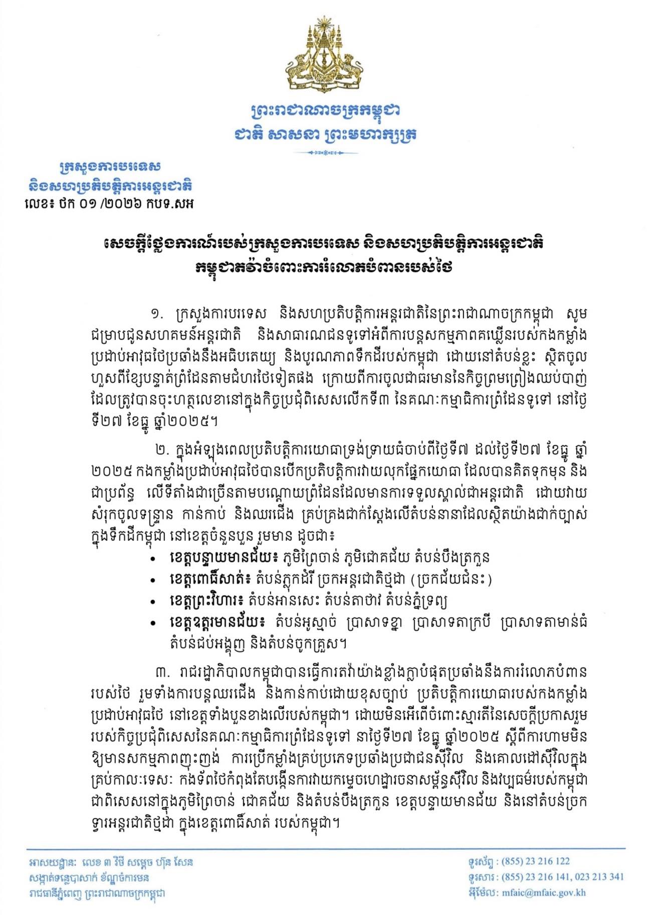 នៅថ្ងៃទី២ ខែមករា ឆ្នាំ២០២៦ ក្រសួងការបរទេស និងសហប្រតិបត្តិការអន្តរជាតិ បានចេញសេចក្តីថ្លែងការណ៍ ស្ដីពី ការតវ៉ារបស់កម្ពុជាចំពោះការរំលោភបំពានរបស់ថៃ។ កម្ពុជាសង្ឃឹមថាសហគមន៍អន្តរជាតិនឹងជួយជំរុញប្រទេសថៃឱ្យដោះស្រាយជម្លោះព្រំដែន ស្របតាមច្បាប់អន្តរជាតិ និងកាតព្វកិច្ចរបស់ខ្លួន ក្រោមសន្ធិសញ្ញា និងកិច្ចព្រមព្រៀងដែលមានស្រាប់។ ...