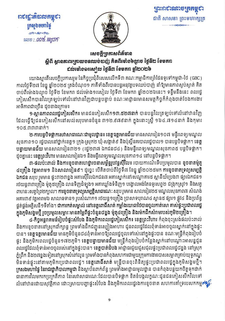 នៅថ្ងៃទី២ ខែមករា ឆ្នាំ២០២៦ ក្រសួងមហាផ្ទៃ បានចេញសេចក្តីប្រកាសព័ត៌មាន ស្តីពី ស្ថានភាពក្រោយបទឈប់បាញ់ គិតពីម៉ោង១រសៀល ដល់ម៉ោង៦ល្ងាច ថ្ងៃទី២ ខែមករា ឆ្នាំ២០២៦។មានជនភៀសសឹក៦៧.០៧៧នាក់ បានបន្តវិលត្រឡប់ទៅលំនៅឋានវិញ ដែលធ្វើឱ្យជនភៀសសឹកនៅសល់សរុបមានចំនួន ៣២៦.៥៦៣នាក់ ក្នុងនោះស្រី្ត ១៧១.៩៨៧នាក់ និងកុមារ១០៥.៣៣៣នាក់។ ...