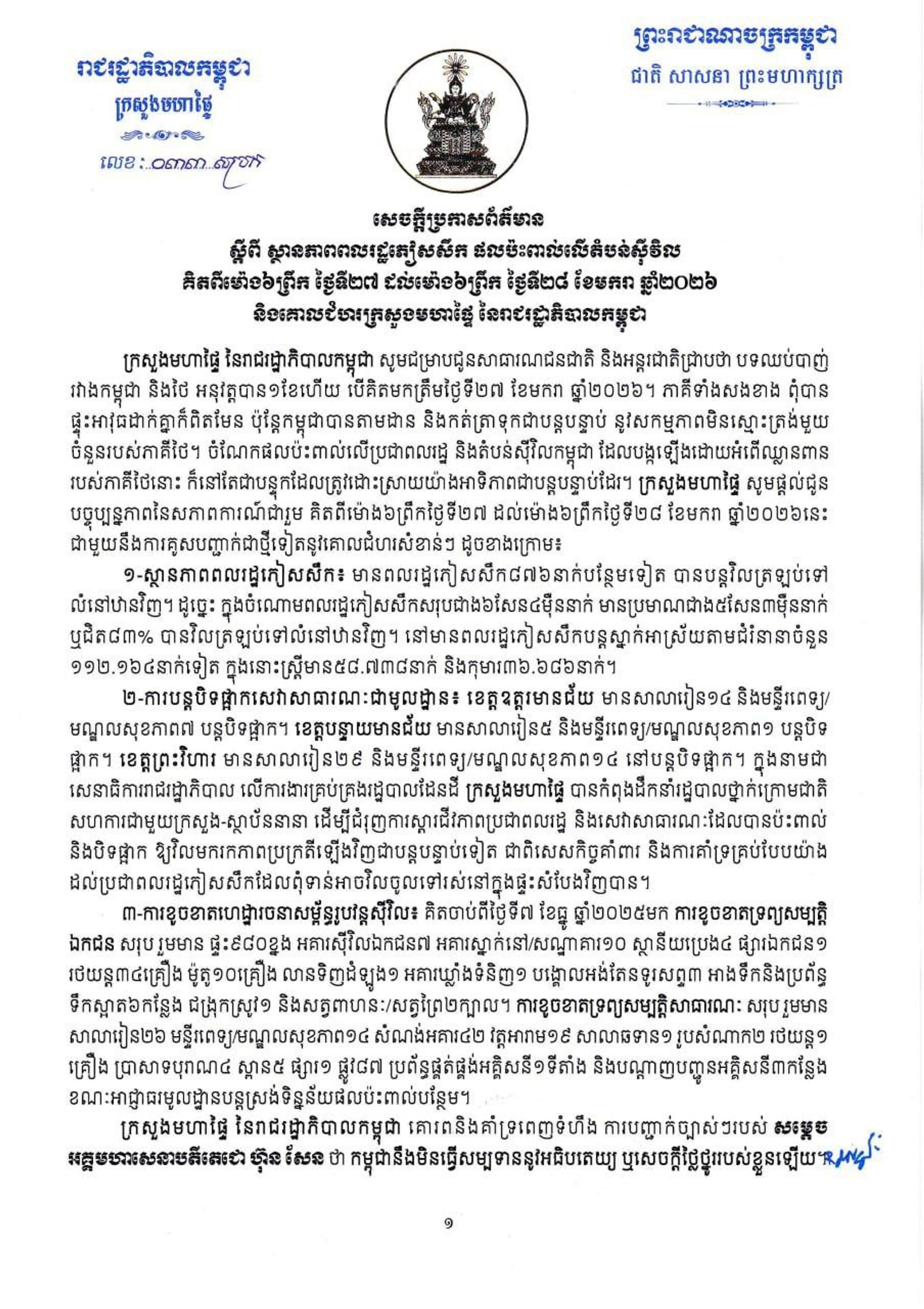 • នៅ​ថ្ងៃ​ទី​២៦​ ខែមករា​ ឆ្នាំ​២០២៦ ក្រសួងការបរទេស និងសហប្រតិបត្តិការអន្តរជាតិ បានចេញសេចក្ដីប្រកាសព័ត៌មាន ស្ដីពី ឯកឧត្តមឧបនាយករដ្ឋមន្ត្រី ប្រាក់ សុខុន នឹងអញ្ជើញចូលរួមកិច្ចប្រជុំចង្អៀត រដ្ឋមន្ត្រីការបរទេសអាស៊ាន និងកិច្ចប្រជុំពាក់ព័ន្ធ នៅប្រទេសហ្វីលីពីន។ក្រោមមូលបទ «ដំណើរឆ្ពោះទៅកាន់អនាគតរួមគ្នា» កិច្ចប្រជុំនេះនឹងពិនិត្យឡើងវិញនូវវឌ្ឍនភាព ដែលសម្រេចបានចាប់តាំងពីកិច្ចប្រជុំកំពូលអាស៊ានលើកទី៤៧ និងកិច្ចប្រជុំកំពូលពាក់ព័ន្ធ ដែលប្រព្រឹត្តទៅនៅប្រទេសម៉ាឡេស៊ី ព្រមទាំងពិភាក្សាអំពីអាទិភាពនិងសមិទ្ធផលសំខាន់ៗ ក្រោមភាពជាប្រធានអាស៊ានរបស់ហ្វីលីពីនសម្រាប់ឆ្នាំ២០២៦ ក្នុងគោលបំណងសម្រេចឱ្យបាននូវសហគមន៍អាស៊ាន ឆ្នាំ២០៤៥។ ...