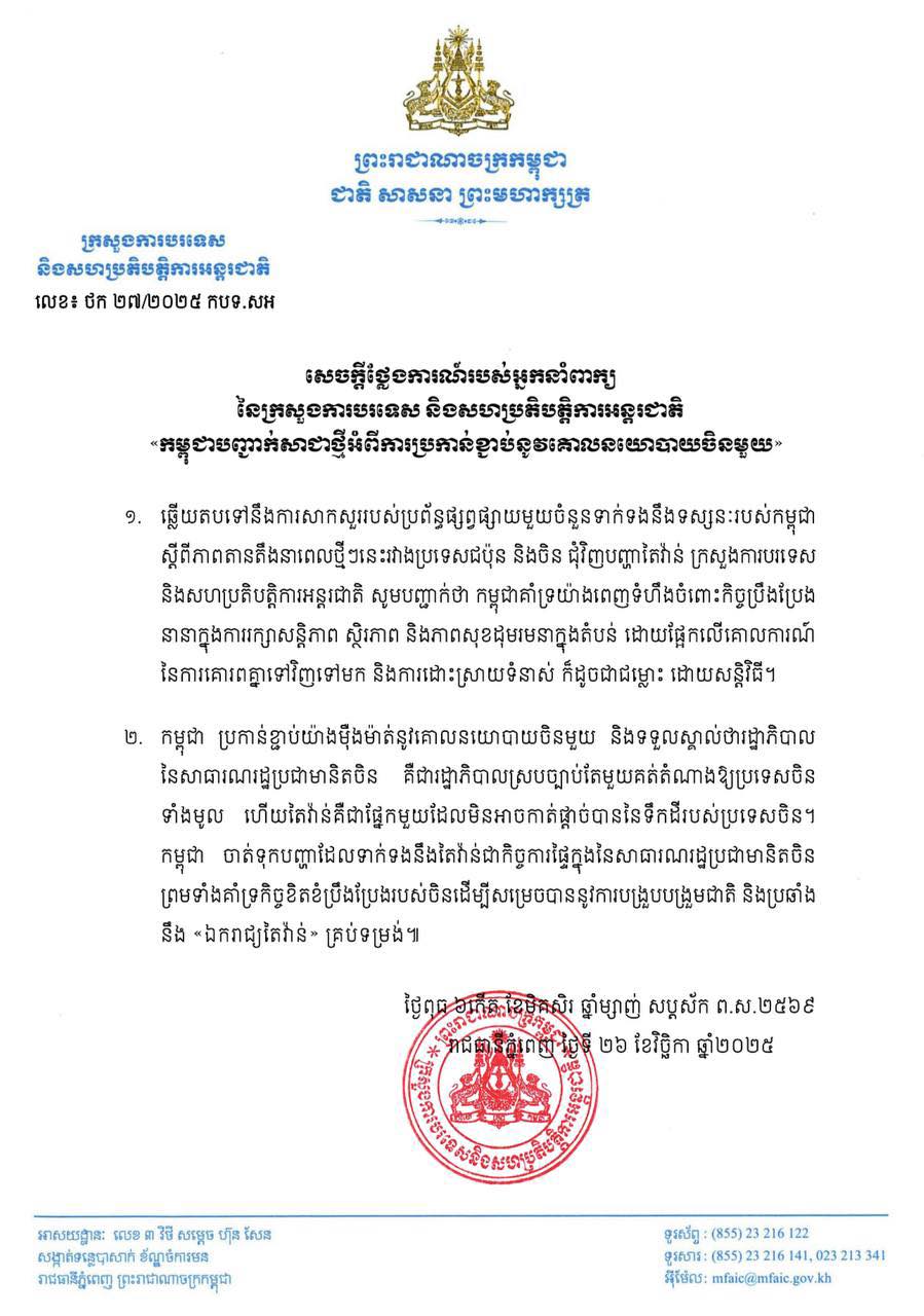 • នៅថ្ងៃទី២៦ ខែវិច្ឆិកាឆ្នាំ២០២៥ ក្រសួងការបរទេស និងសហប្រតិបត្តិការអន្តរជាតិ បានចេញសេចក្តីថ្លែងការណ៍ ស្តីពី ប្រកាន់ខ្ជាប់នូវគោលនយោបាយចិនតែមួយ។ កម្ពុជាប្រកាន់ខ្ជាប់យ៉ាងម៉ឺងម៉ាត់នូវគោលនយោបាយចិនតែមួយ និងទទួលស្គាល់ថារដ្ឋាភិបាលនៃសាធារណរដ្ឋប្រជាមានិតចិន គឺជារដ្ឋាភិបាលស្របច្បាប់តែមួយគត់តំណាងឱ្យប្រទេសចិនទាំងមូល។ ...