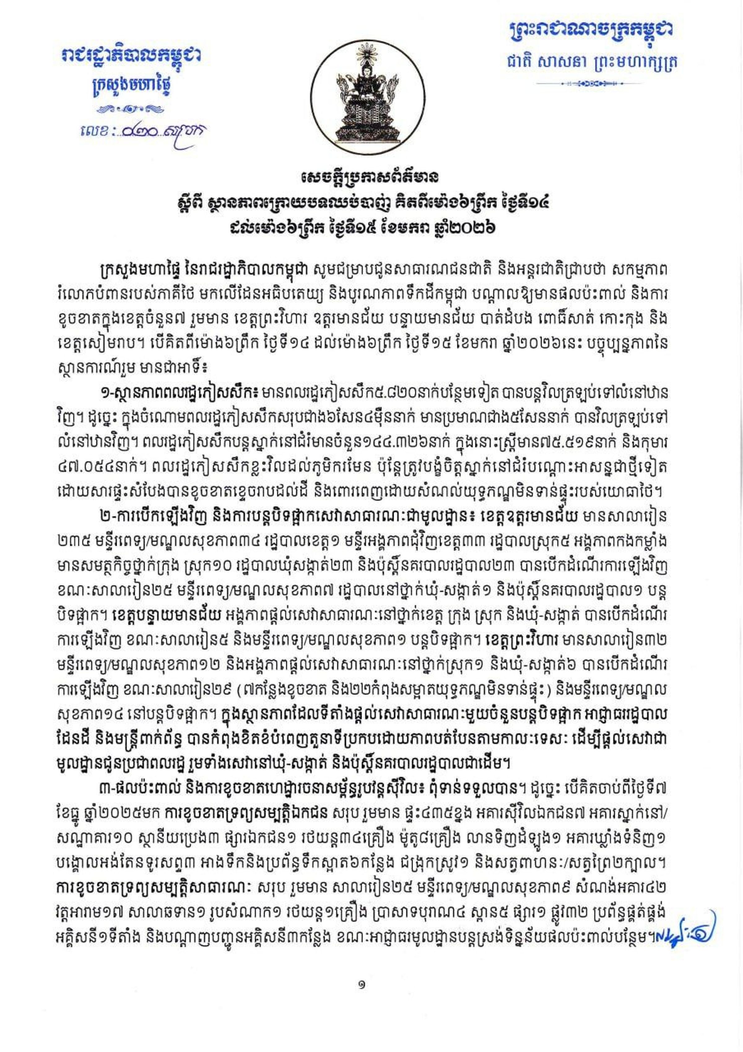 • សេចក្ដីប្រកាសព័ត៌មាន៖ ស្ថានភាពក្រោយបទឈប់បាញ់ គិតពីម៉ោង៦ព្រឹក ថ្ងៃទី១៣ ដល់ម៉ោង៦ព្រឹក ថ្ងៃទី១៤ ខែមករា ឆ្នាំ២០២៦
