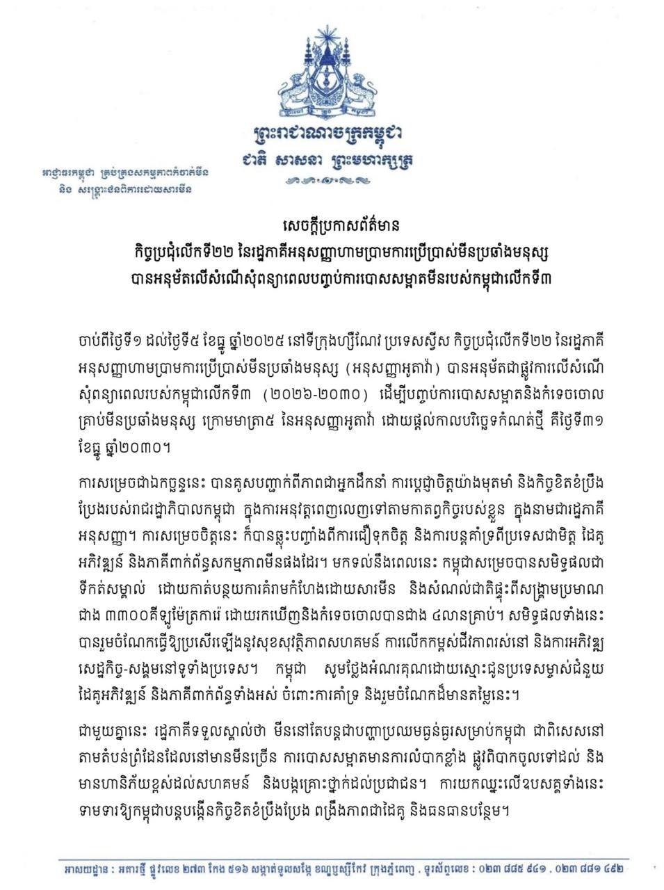 • កម្ពុជា​ពន្យាពេល​​បញ្ចប់​ការ​បោសសម្អាត​មីនលើកទី៣​ដល់​ចុង​ឆ្នាំ​២០៣០
