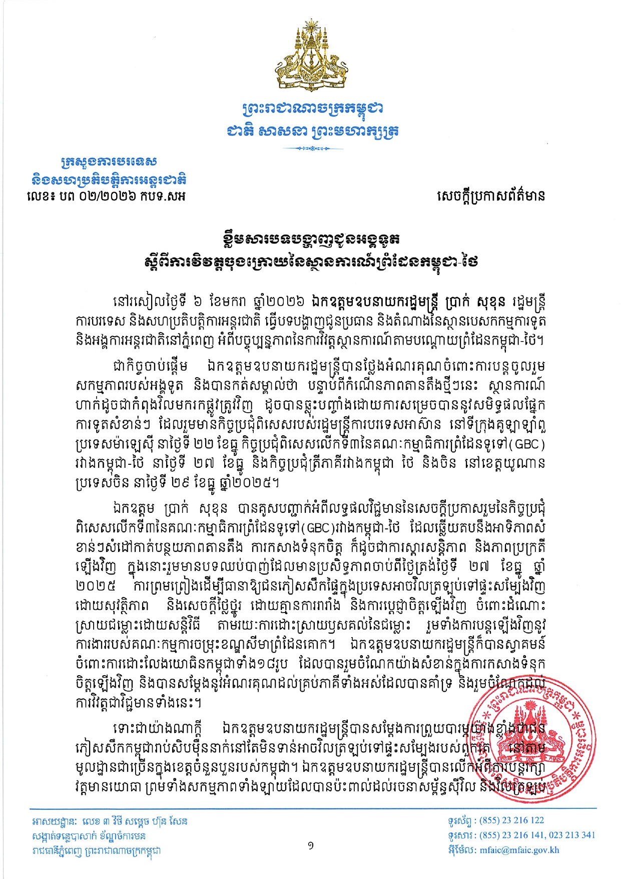 • នៅថ្ងៃទី៦ ខែមករា ឆ្នាំ២០២៦ ក្រសួងការបរទេស និងសហប្រតិបត្តិការអន្តរជាតិ បានចេញសេចក្ដីប្រកាសព័ត៌មាន​ ស្ដីពី ខ្លឹមសារបទបង្ហាញជូនអង្គទូត ស្ដីពី​ ការវិវត្តចុងក្រោយនៃស្ថានការណ៍ព្រំដែនកម្ពុជា-ថៃ។ឯកឧត្តម ប្រាក់ សុខុន បានគូសបញ្ជាក់អំពីលទ្ធផលវិជ្ជមាននៃសេចក្ដីប្រកាសរួមនៃកិច្ចប្រជុំពិសេសលើកទី៣នៃគណៈកម្មាធិការព្រំដែនទូទៅ (GBC) រវាងកម្ពុជា-ថៃ ដែលឆ្លើយតបនឹងអាទិភាពសំខាន់ៗសំដៅកាត់បន្ថយភាពតានតឹង ការកសាងទំនុកចិត្ត ក៏ដូចជាការស្ដារសន្តិភាព និងភាពប្រក្រតីឡើងវិញ។ ...