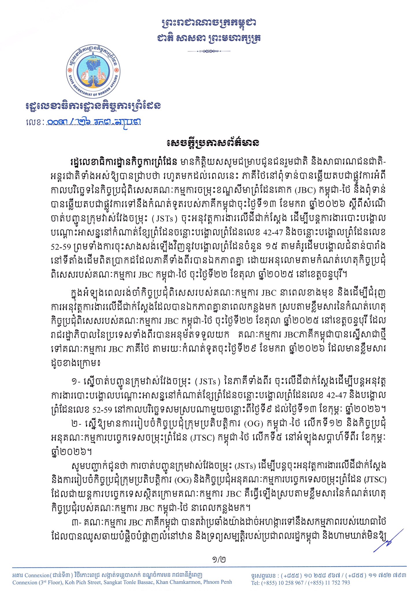 • នៅ​ថ្ងៃ​ទី​៣១ ខែមករា​ ឆ្នាំ​២០២៦​ រដ្ឋលេខាធិការដ្ឋានកិច្ចការព្រំដែន បានចេញសេចក្ដីប្រកាសព័ត៌មាន ស្ដីពី កិច្ចប្រជុំគណៈកម្មការចម្រុះខណ្ឌសីមាព្រំដែនគោក (JBC) កម្ពុជា-ថៃ។ក្នុងអំឡុងពេលរង់ចាំកិច្ចប្រជុំពិសេសរបស់គណៈកម្មការ JBC នាពេលខាងមុខ និងដើម្បីជំរុញការអនុវត្តការងារលើដីជាក់ស្តែងដែលបានឯកភាពគ្នានាពេលកន្លងមក ស្របតាមខ្លឹមសារនៃកំណត់ហេតុ កិច្ចប្រជុំពិសេសរបស់គណៈកម្មការ JBC កម្ពុជា-ថៃ ចុះថ្ងៃទី២២ ខែតុលា ឆ្នាំ២០២៥ នៅខេត្តចន្ទបុរី ដែលរាជរដ្ឋាភិបាលនៃប្រទេសទាំងពីរបានអនុម័តទទួលយកគណៈកម្មការ JBC ភាគីកម្ពុជាបានស្នើសាជាថ្មីទៅគណៈកម្មការ JBC ភាគីថៃ តាមរយៈកំណត់ទូតចុះថ្ងៃទី២៩ ខែមករា ឆ្នាំ២០២៦ ដែលមានខ្លឹមសារដូចមានចែងក្នុងឯកសារភ្ជាប់។ ...
