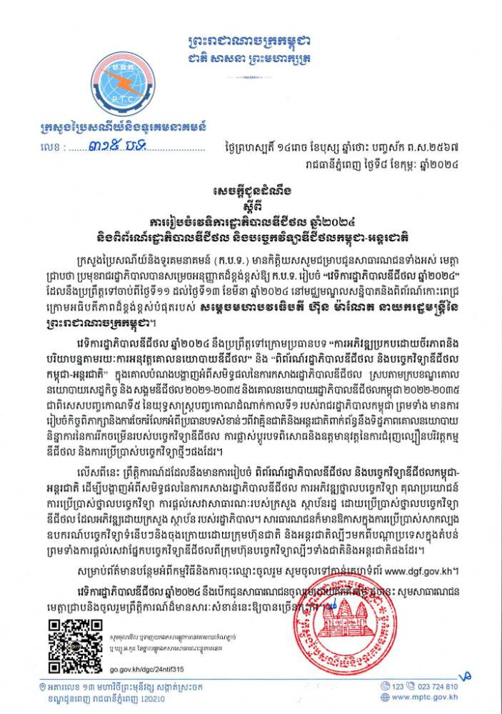 សេចក្តីជូនដំណឹង៖ ការរៀបចំវេទិការដ្ឋាភិបាលឌីជីថល ឆ្នាំ២០២៤ និងពិព័រណ៍រដ្ឋាភិបាលឌីជីថល និងបច្ចេកវិទ្យាឌីជីថលកម្ពុជា-អន្តរជាតិ