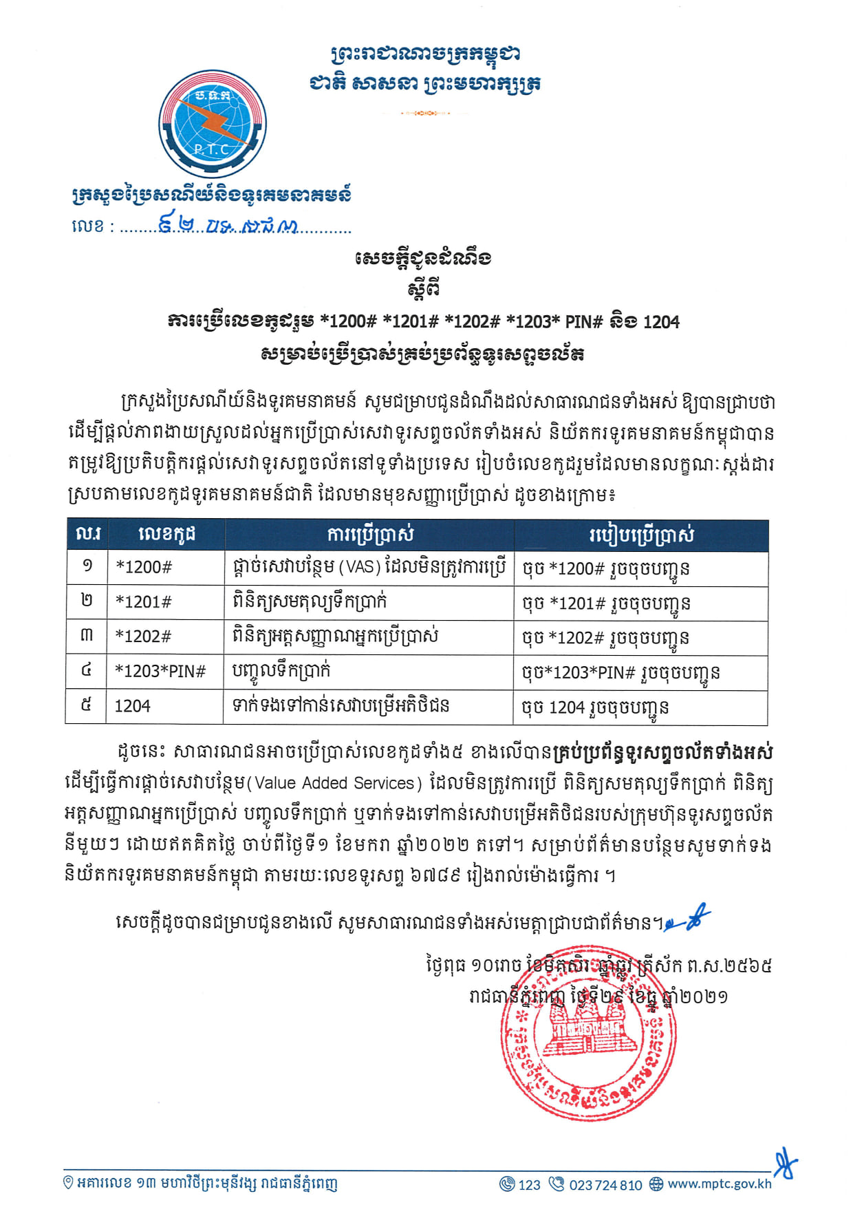 នៅថ្ងៃទី២៩ ខែធ្នូ ឆ្នាំ២០២១ ក្រសួងប្រៃសណីយ៍និងទូរគមនាគមន៍ បានចេញសេចក្ដីជូនដំណឹង ស្ដីពី ការប្រើលេខកូដរួម *1200# *1201# *1202# *1203* PIN# និង 1204 សម្រាប់ប្រើប្រាស់គ្រប់ប្រព័ន្ធទូរសព្ទចល័ត។